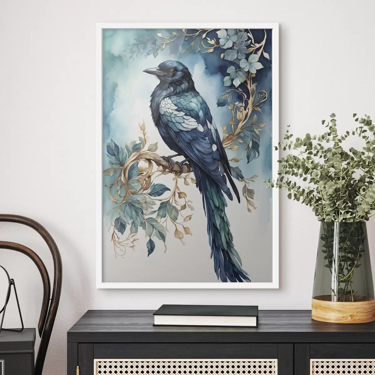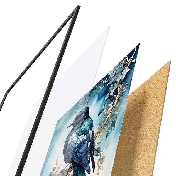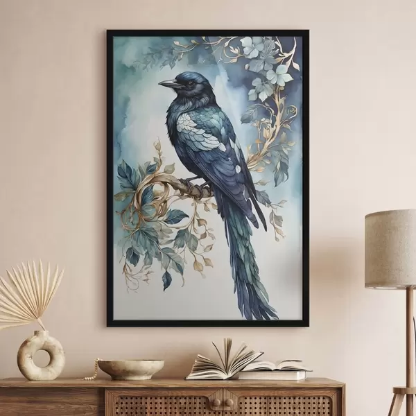 Poster Blauer Vogel auf einem Zweig mit Blättern im Aquarellstil Nr f45483