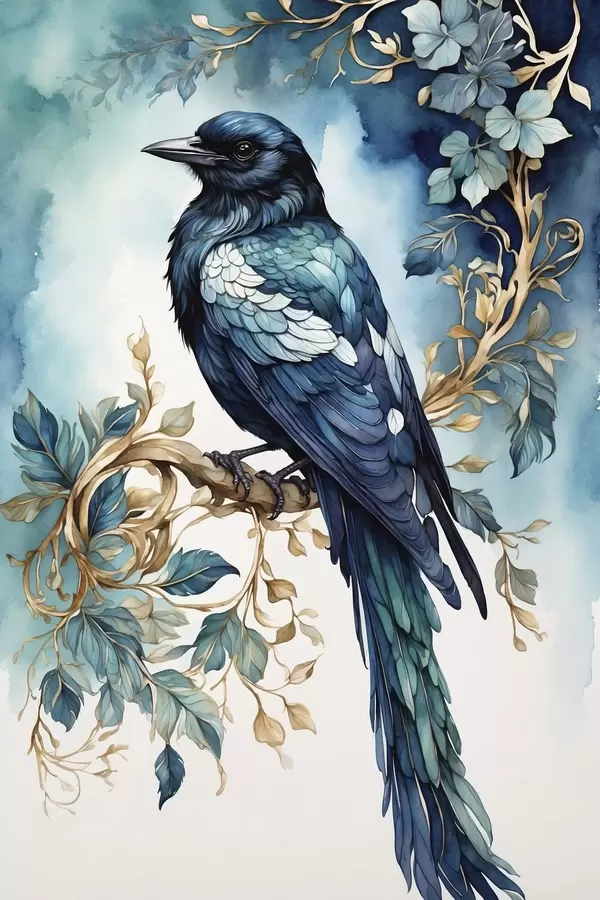 Poster Blauer Vogel auf einem Zweig mit Blättern im Aquarellstil Nr f45483
