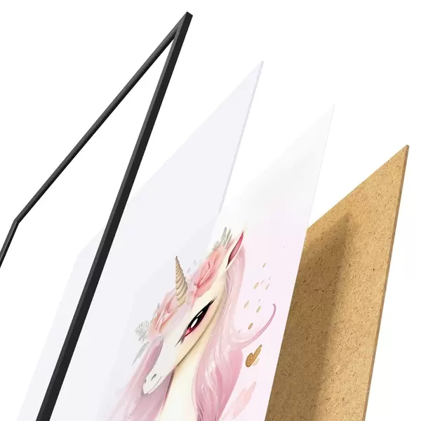 Das Poster besteht aus einem Rahmen, Plexiglas, einem gedruckten Bild und einer Rückwand aus Spanplatten. Dank der Halterungen auf der Rückseite kann das Poster sofort an die Wand gehängt werden.