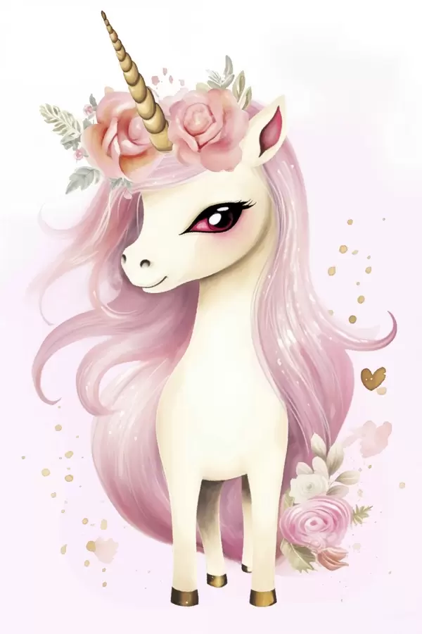 Poster Einhorn mit rosa Mähne und Blumenkranz f45484