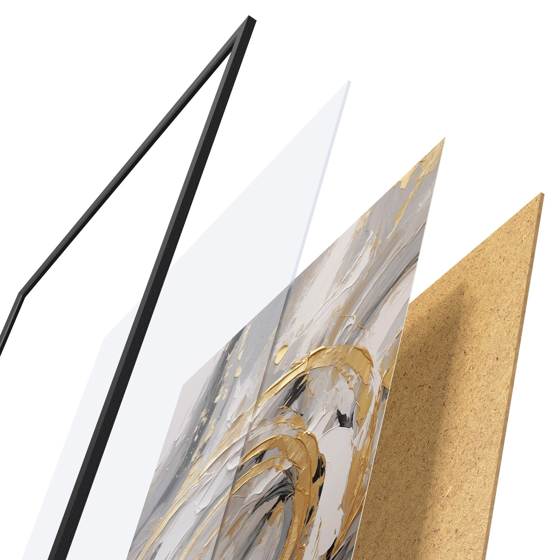Das Poster besteht aus einem Rahmen, Plexiglas, einem gedruckten Bild und einer Rückwand aus Spanplatten. Dank der Halterungen auf der Rückseite kann das Poster sofort an die Wand gehängt werden.