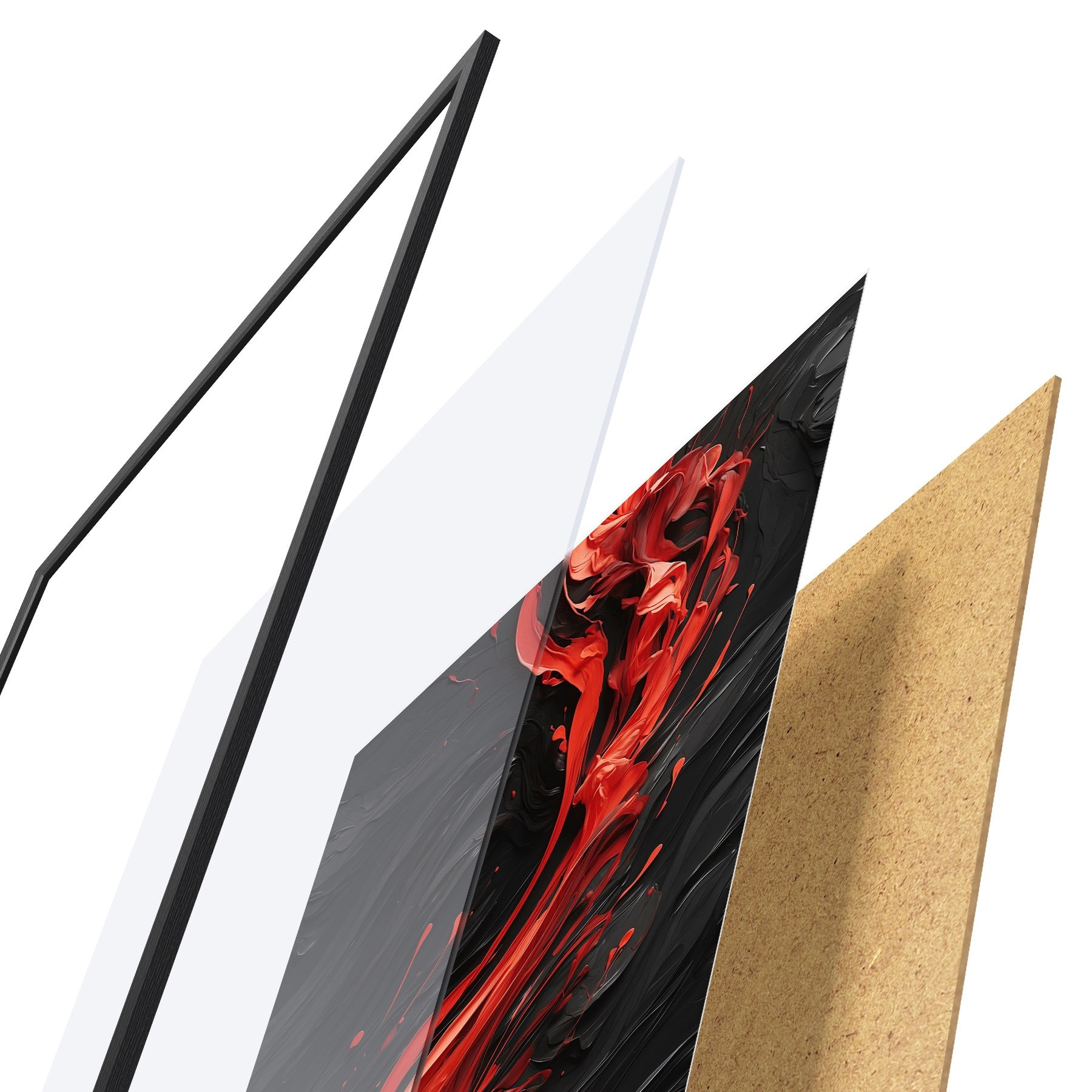Das Poster besteht aus einem Rahmen, Plexiglas, einem gedruckten Bild und einer Rückwand aus Spanplatten. Dank der Halterungen auf der Rückseite kann das Poster sofort an die Wand gehängt werden.
