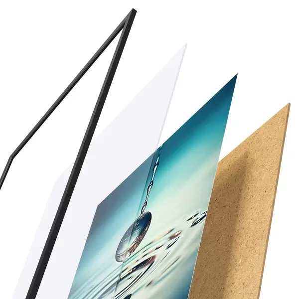 Das Poster besteht aus einem Rahmen, Plexiglas, einem gedruckten Bild und einer Rückwand aus Spanplatten. Dank der Halterungen auf der Rückseite kann das Poster sofort an die Wand gehängt werden.
