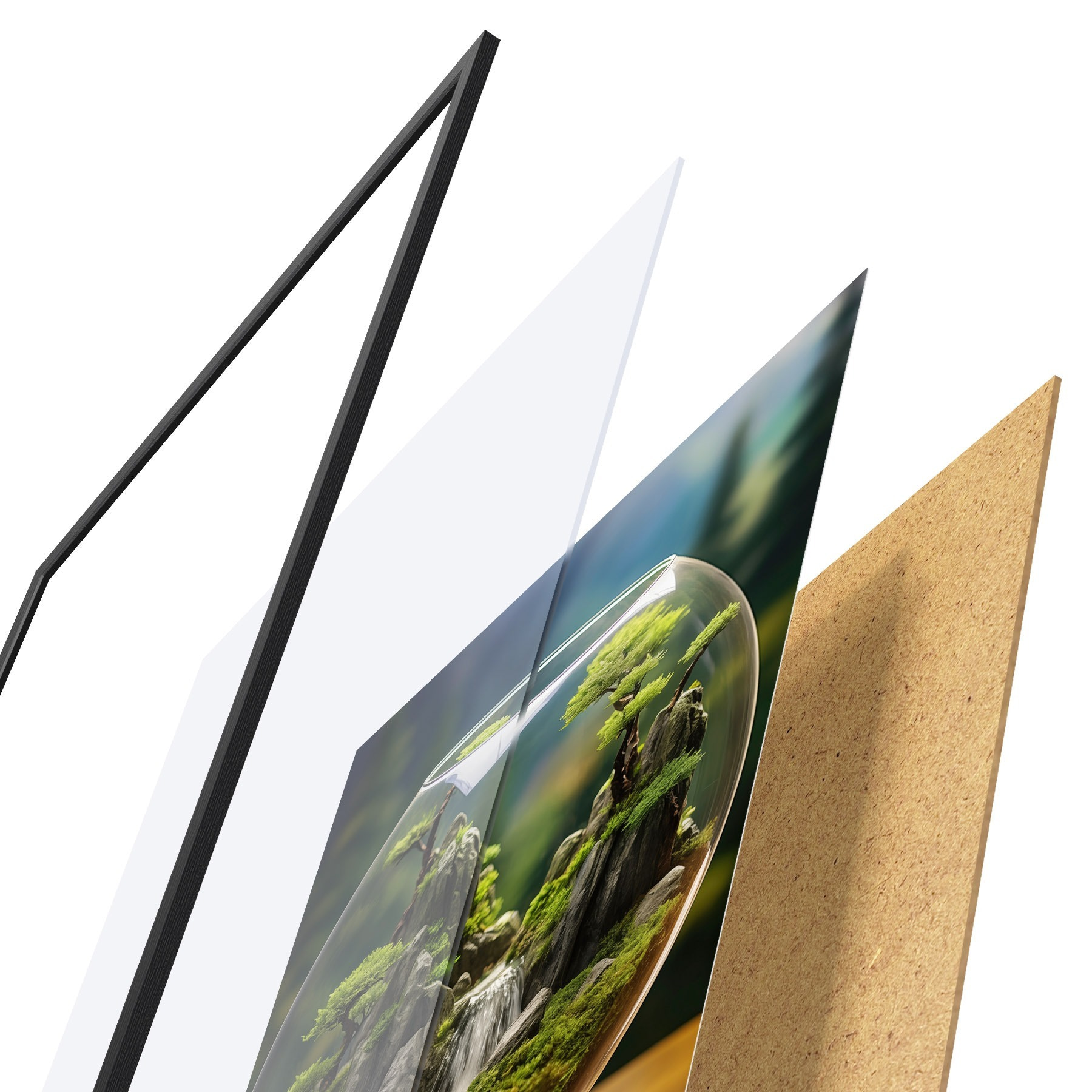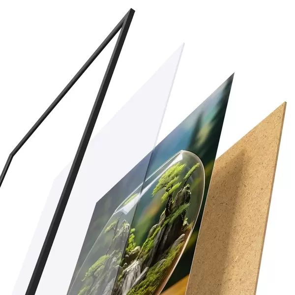 Das Poster besteht aus einem Rahmen, Plexiglas, einem gedruckten Bild und einer Rückwand aus Spanplatten. Dank der Halterungen auf der Rückseite kann das Poster sofort an die Wand gehängt werden.