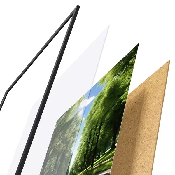 Das Poster besteht aus einem Rahmen, Plexiglas, einem gedruckten Bild und einer Rückwand aus Spanplatten. Dank der Halterungen auf der Rückseite kann das Poster sofort an die Wand gehängt werden.