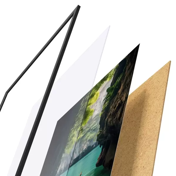 Das Poster besteht aus einem Rahmen, Plexiglas, einem gedruckten Bild und einer Rückwand aus Spanplatten. Dank der Halterungen auf der Rückseite kann das Poster sofort an die Wand gehängt werden.
