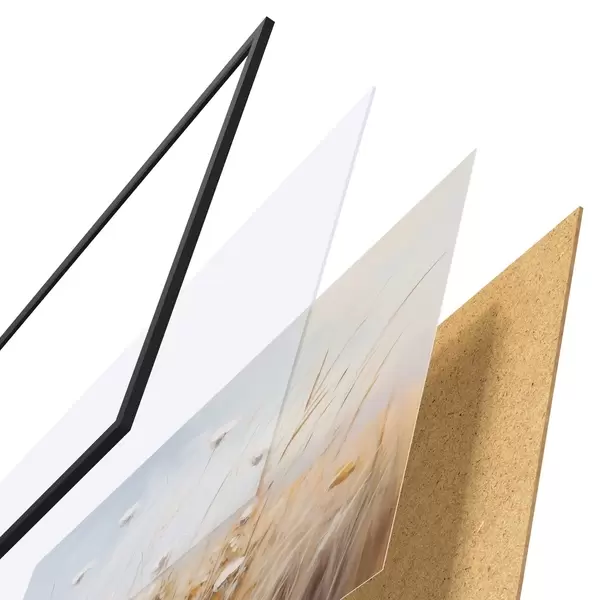 Das Poster besteht aus einem Rahmen, Plexiglas, einem gedruckten Bild und einer Rückwand aus Spanplatten. Dank der Halterungen auf der Rückseite kann das Poster sofort an die Wand gehängt werden.