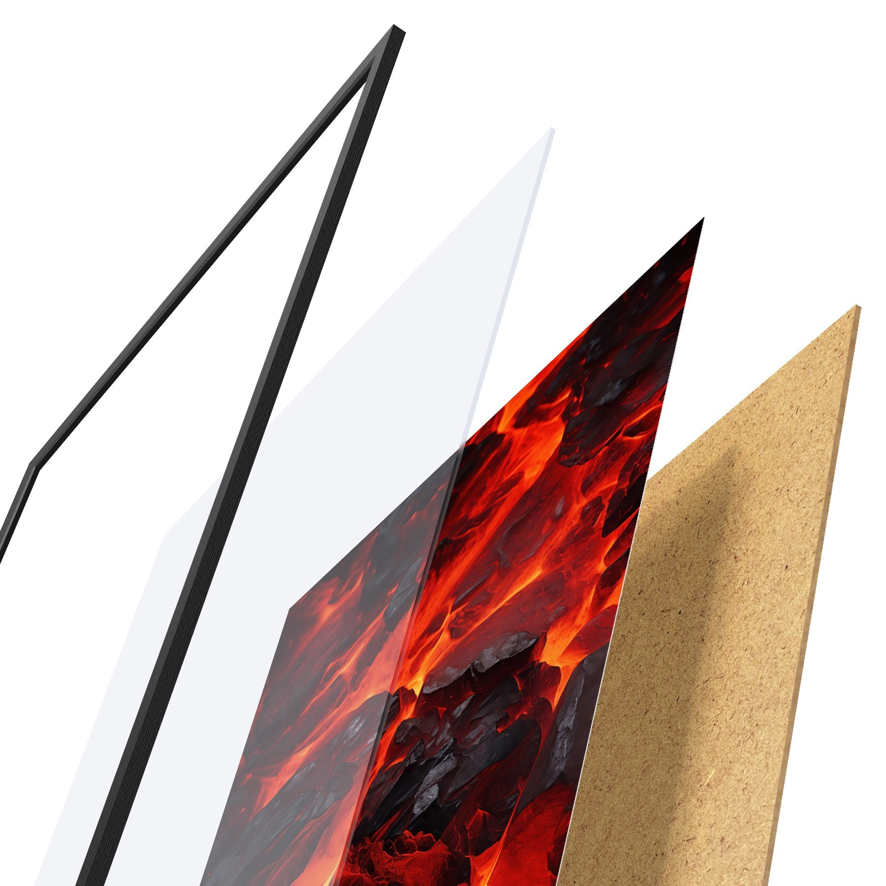 Das Poster besteht aus einem Rahmen, Plexiglas, einem gedruckten Bild und einer Rückwand aus Spanplatten. Dank der Halterungen auf der Rückseite kann das Poster sofort an die Wand gehängt werden.