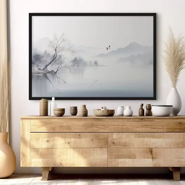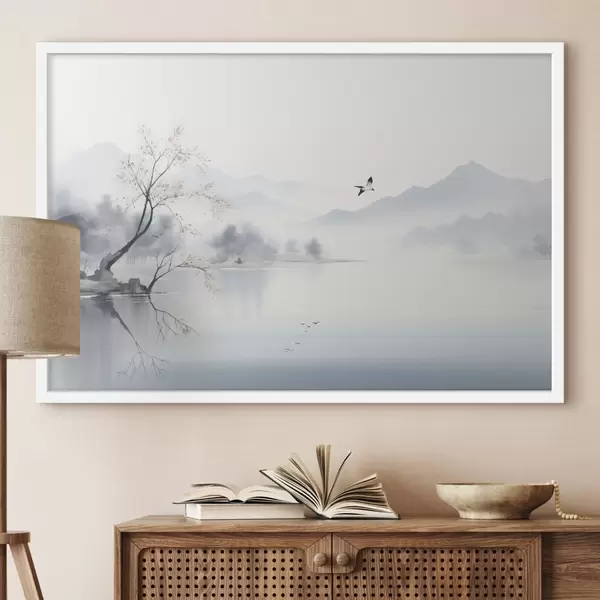 Poster Neblige Landschaft mit einem Baum, Bergen und Vögeln Nr f45518