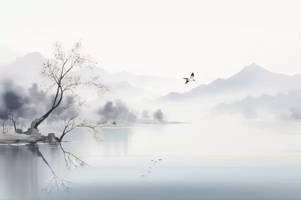 Poster Neblige Landschaft mit einem Baum, Bergen und Vögeln Nr f45518