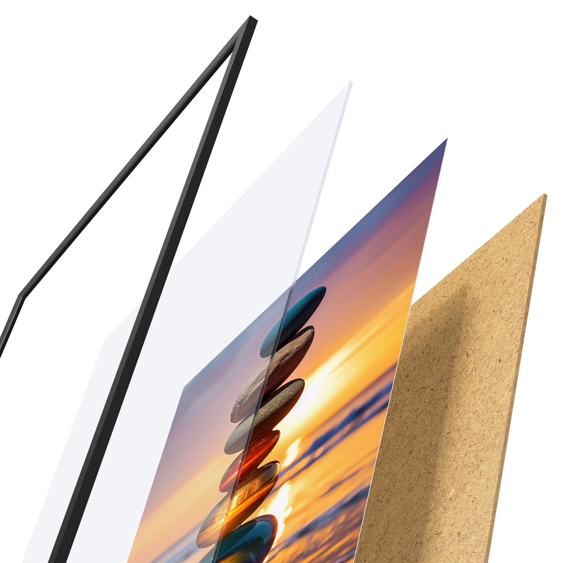 Das Poster besteht aus einem Rahmen, Plexiglas, einem gedruckten Bild und einer Rückwand aus Spanplatten. Dank der Halterungen auf der Rückseite kann das Poster sofort an die Wand gehängt werden.