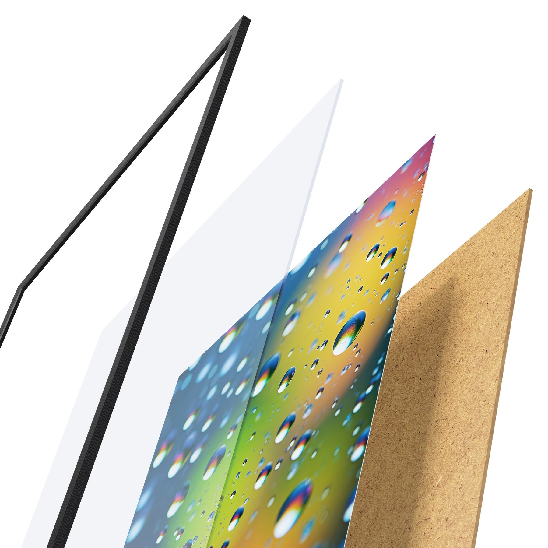 Das Poster besteht aus einem Rahmen, Plexiglas, einem gedruckten Bild und einer Rückwand aus Spanplatten. Dank der Halterungen auf der Rückseite kann das Poster sofort an die Wand gehängt werden.