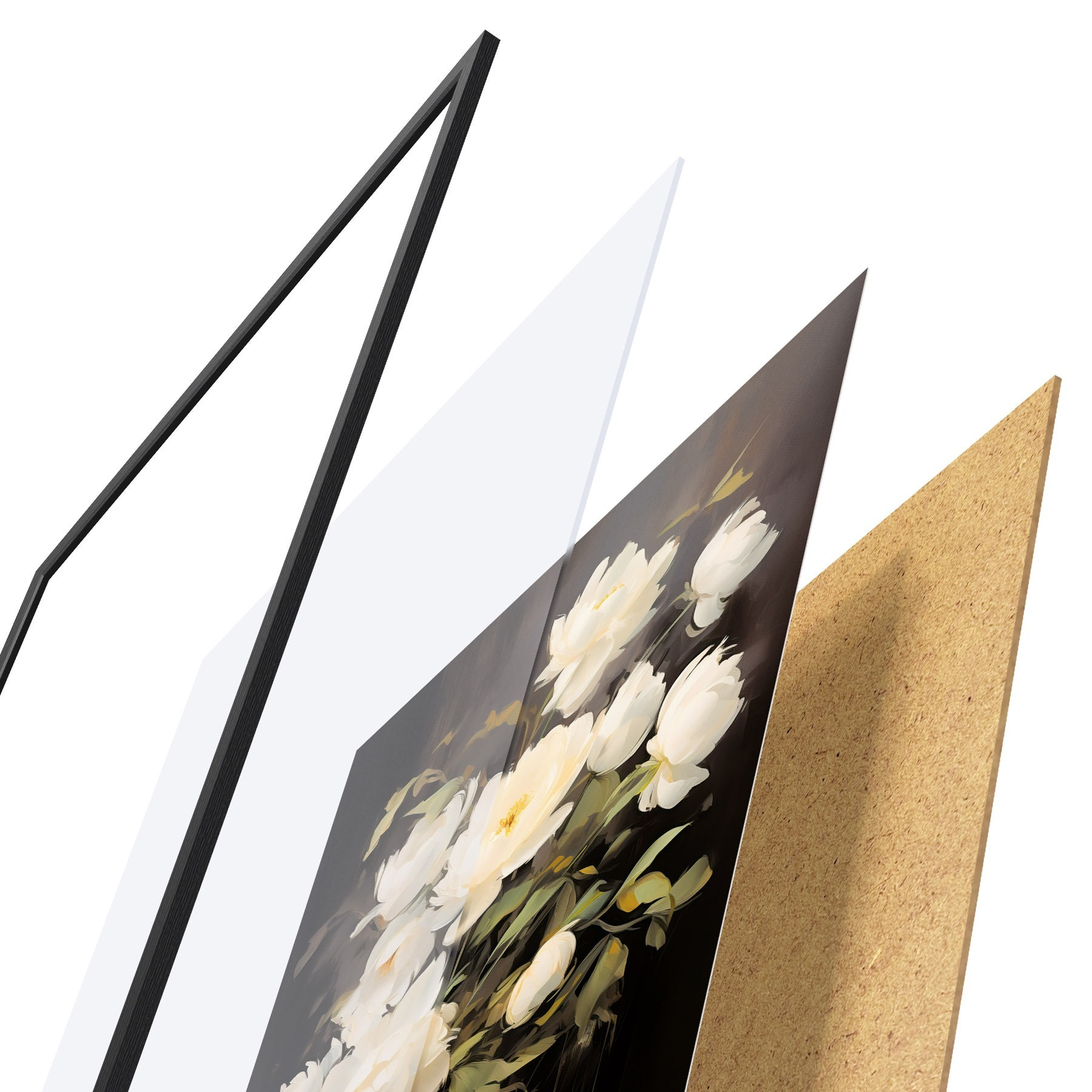 Das Poster besteht aus einem Rahmen, Plexiglas, einem gedruckten Bild und einer Rückwand aus Spanplatten. Dank der Halterungen auf der Rückseite kann das Poster sofort an die Wand gehängt werden.