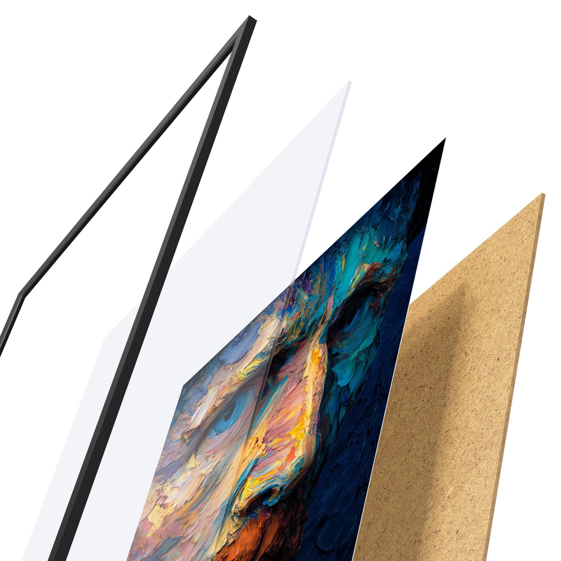 Das Poster besteht aus einem Rahmen, Plexiglas, einem gedruckten Bild und einer Rückwand aus Spanplatten. Dank der Halterungen auf der Rückseite kann das Poster sofort an die Wand gehängt werden.