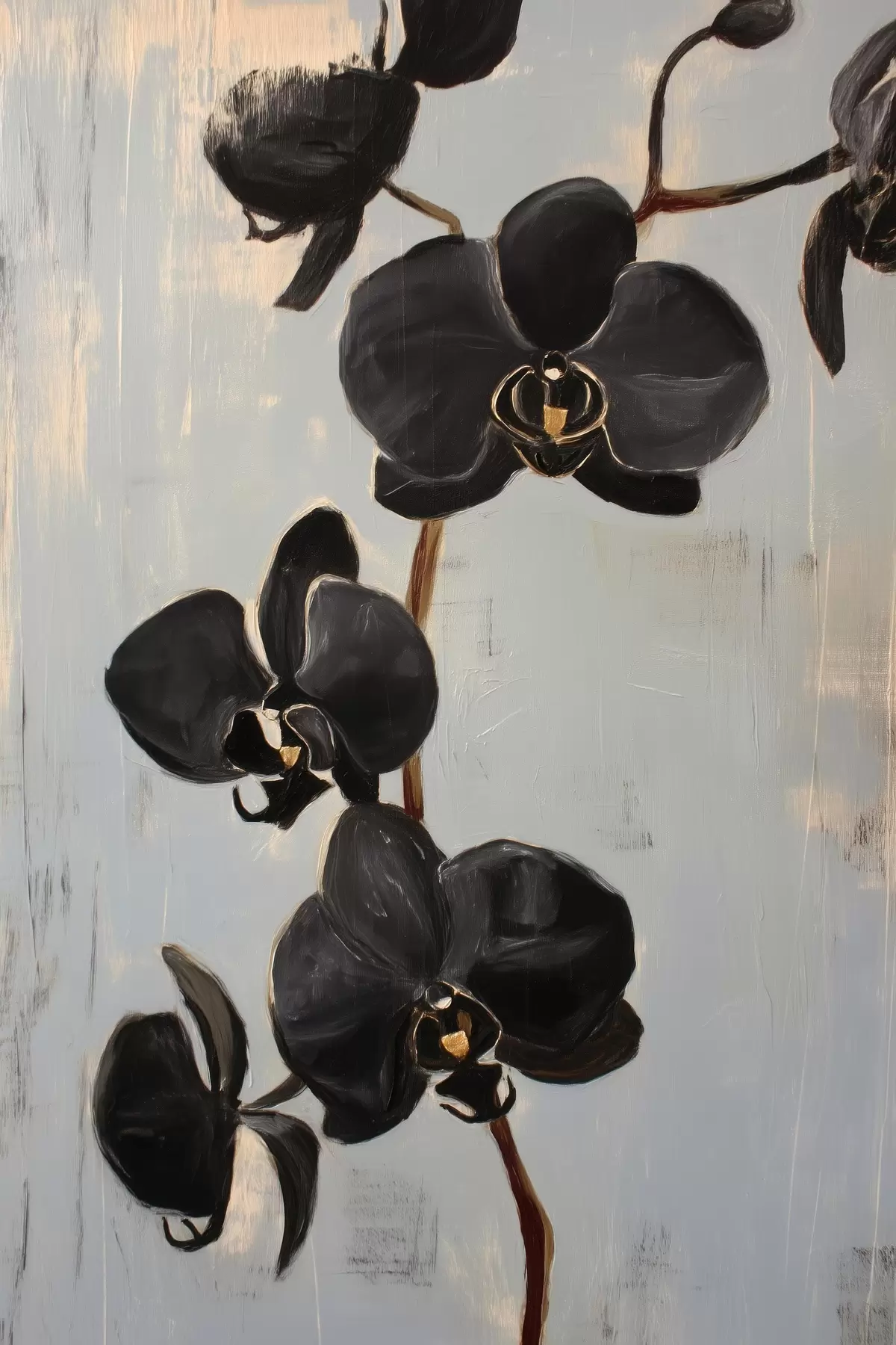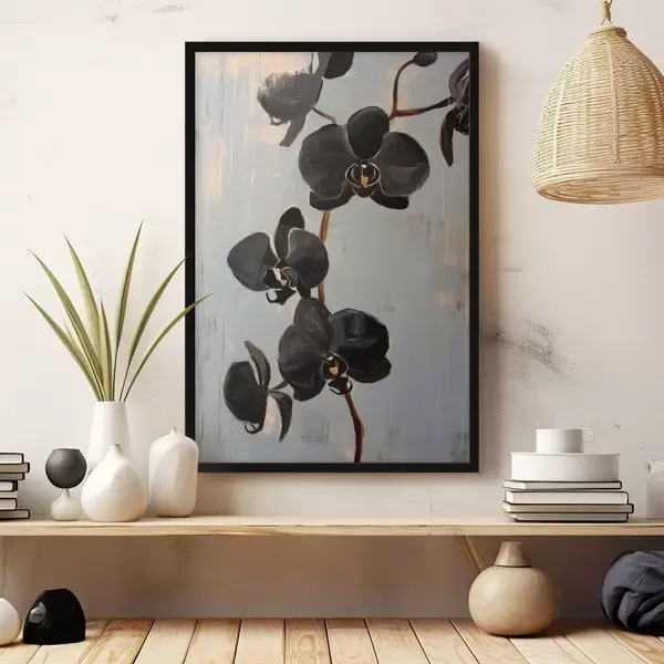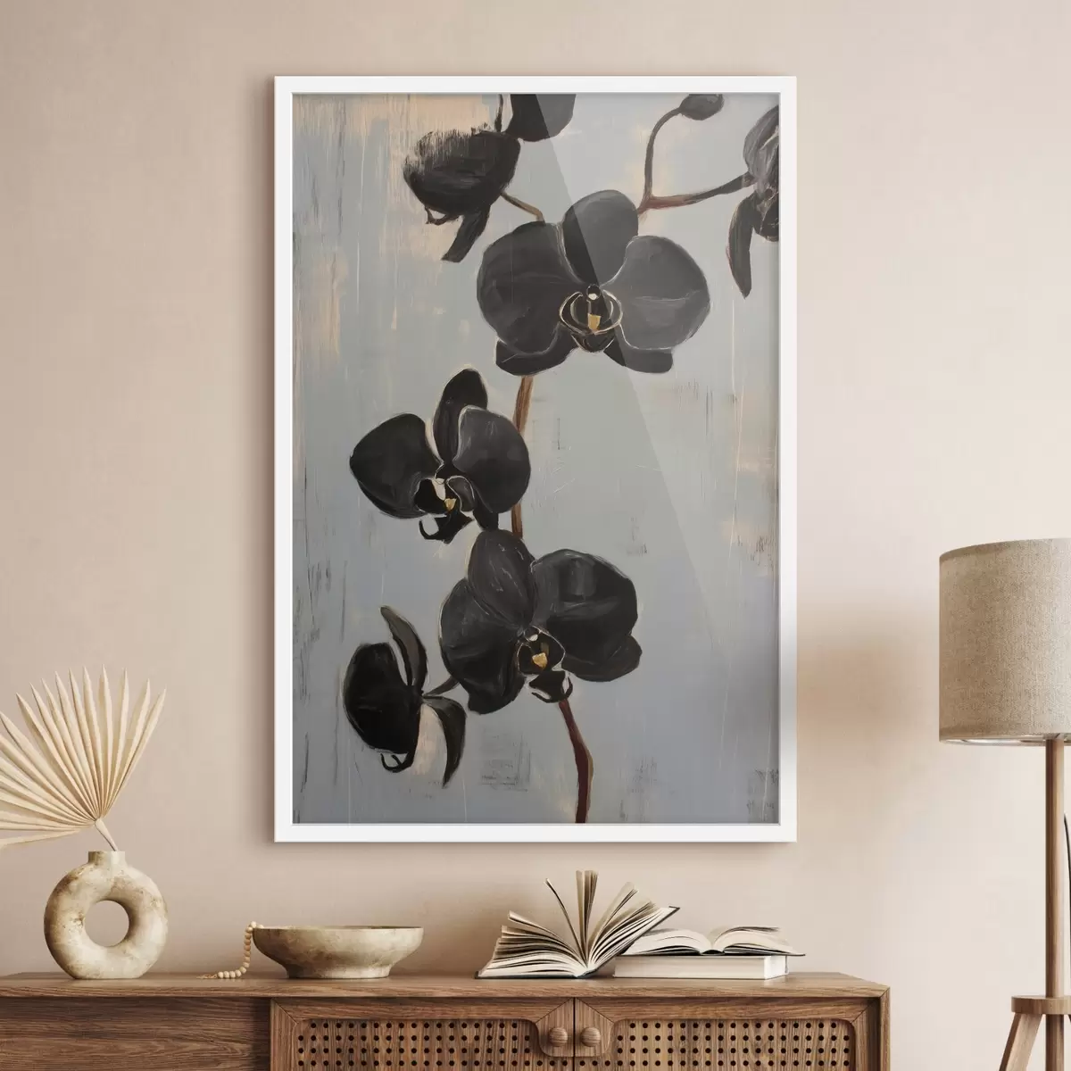 Poster Dekorative Orchideen: schwarze Blumen auf grauem Hintergrund Nr f45547