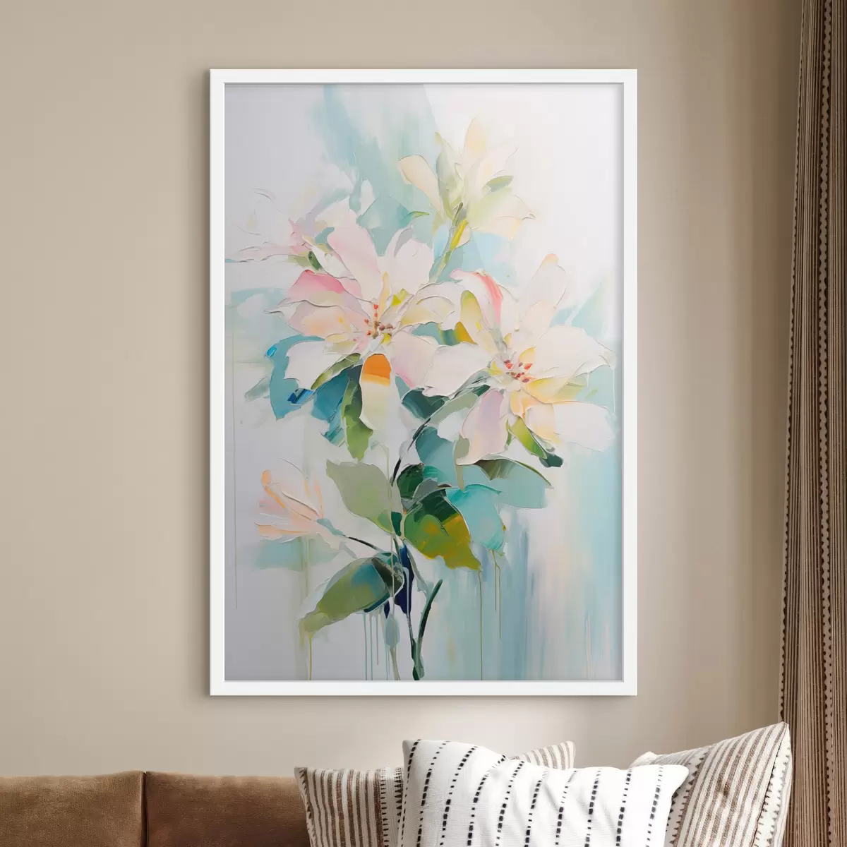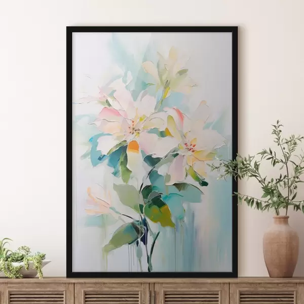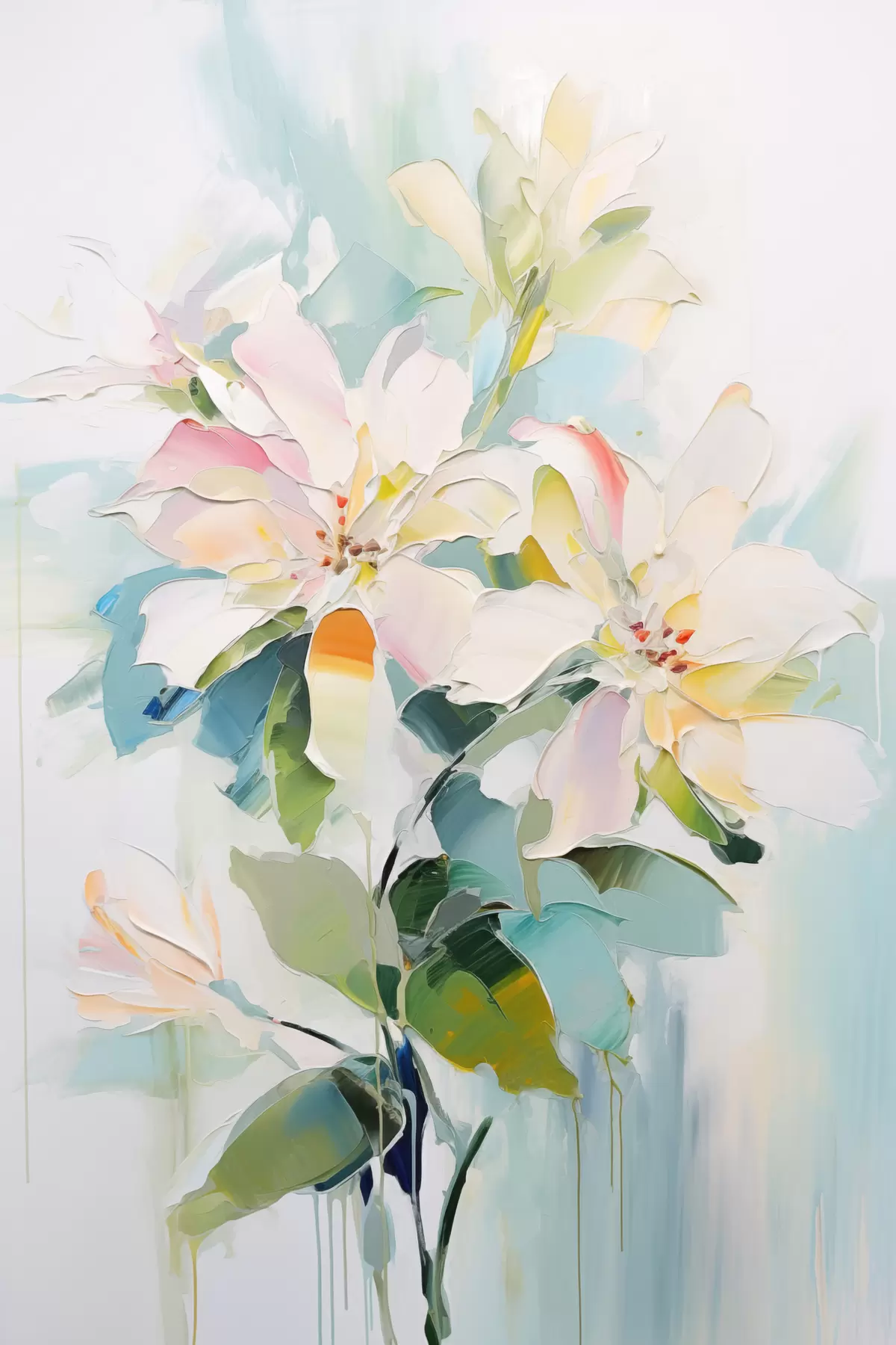Poster Blumen mit bunten Akzenten, grüne Blätter, weiche Pinselstriche Ölgemälde Nachahmung, hellblauem Hintergrund Nr f45549