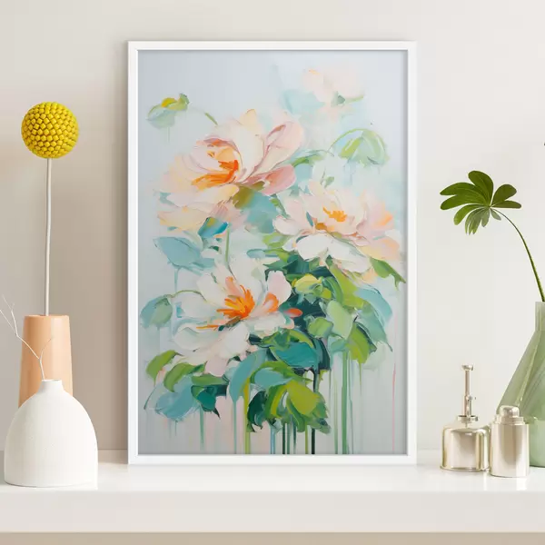 Poster Weiß und Pastell Pfirsich Blumen, grüne Blätter, weiche Pinselstriche Ölgemälde Nachahmung, hellblauem Hintergrund Nr f45550