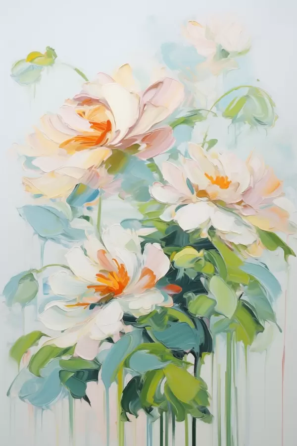 Poster Weiß und Pastell Pfirsich Blumen, grüne Blätter, weiche Pinselstriche Ölgemälde Nachahmung, hellblauem Hintergrund Nr f45550