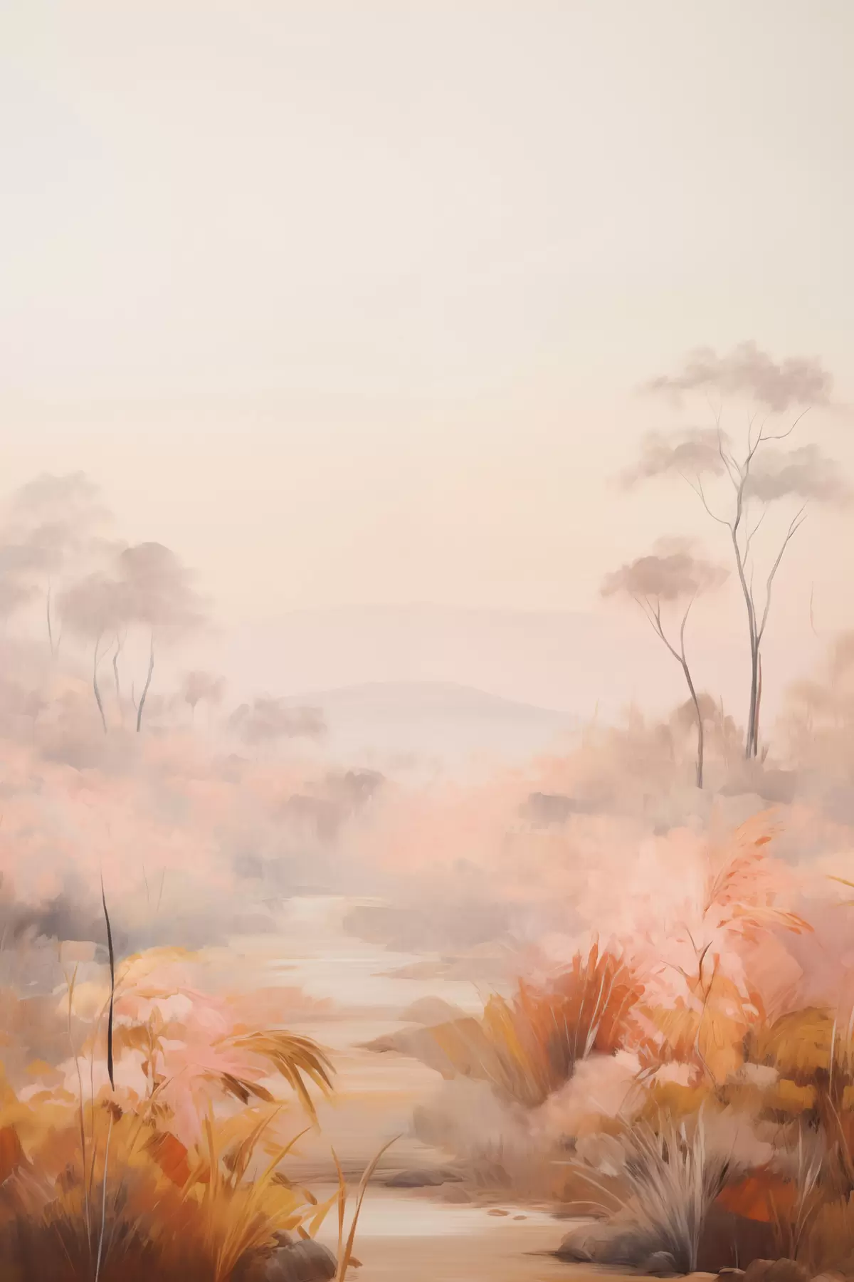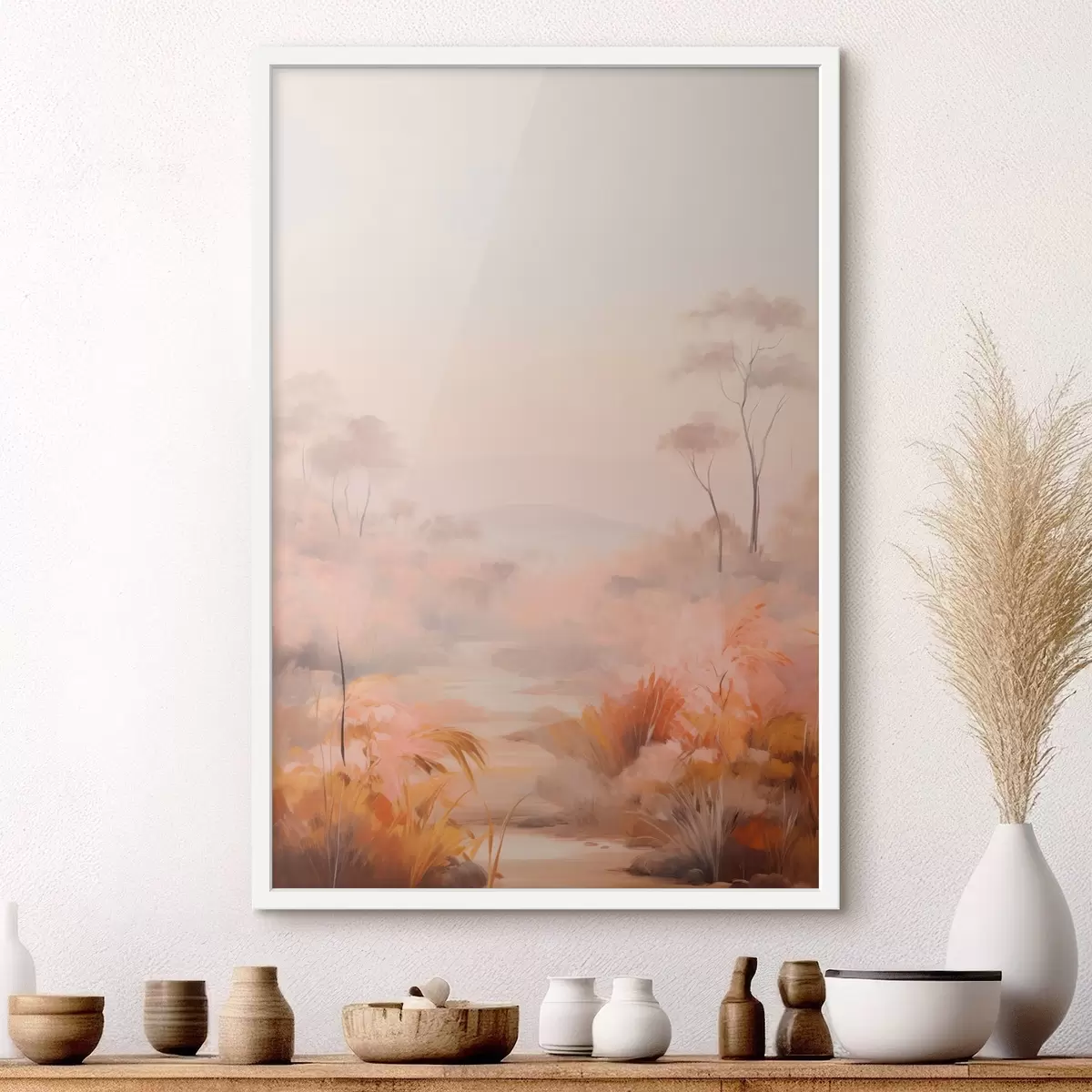 Poster Eine Landschaft mit Sträuchern und Bäumen in Rosa-, Orange- und Brauntönen, mit Bergen im Hintergrund Nr f45553