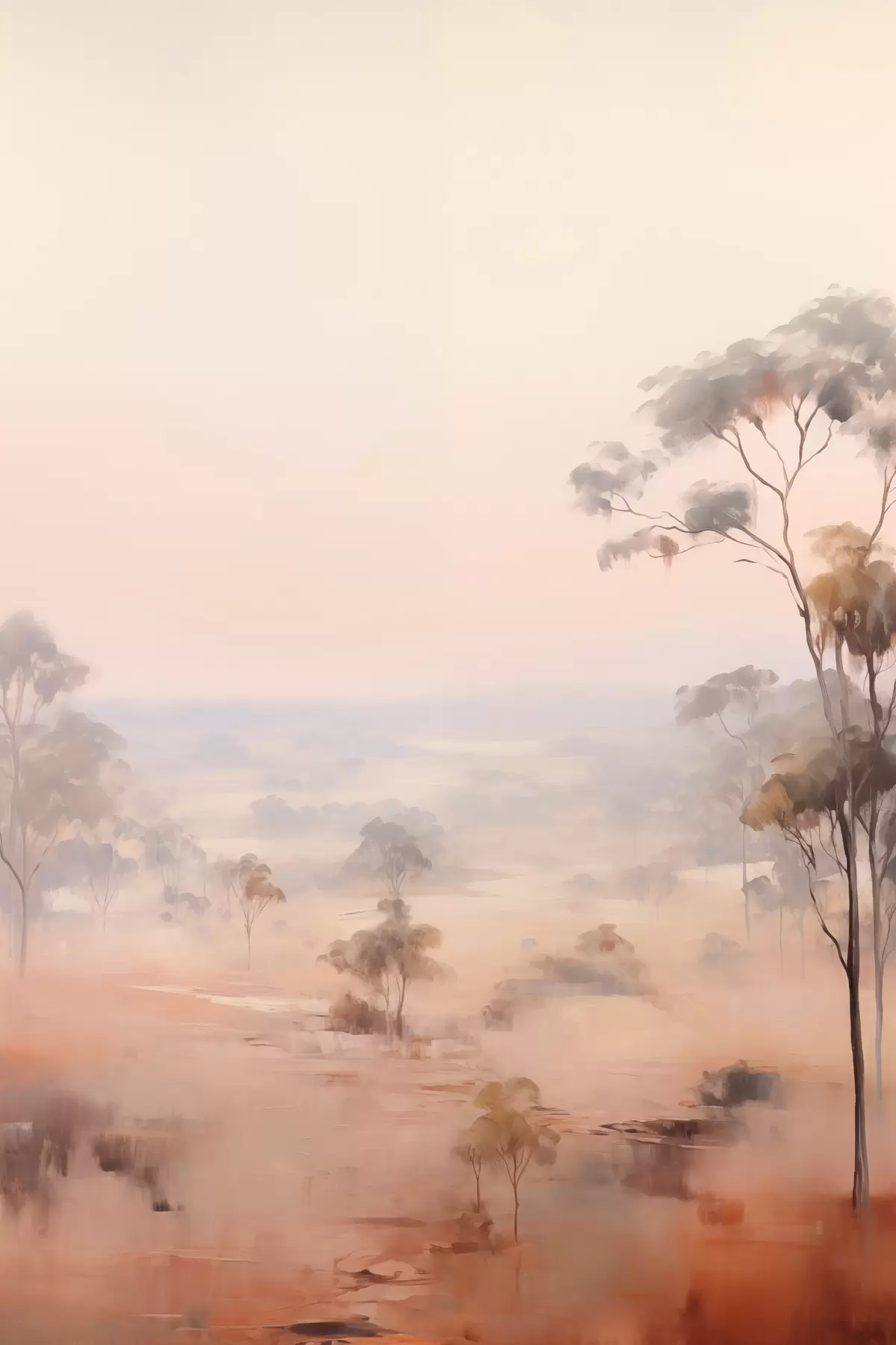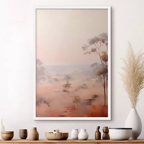 Poster Eine Landschaft mit Sträuchern und Bäumen in Pastelltönen von Rosa, Orange und Braun, mit Bergen im Hintergrund Nr f45554