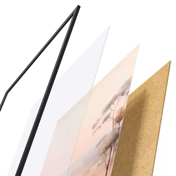 Das Poster besteht aus einem Rahmen, Plexiglas, einem gedruckten Bild und einer Rückwand aus Spanplatten. Dank der Halterungen auf der Rückseite kann das Poster sofort an die Wand gehängt werden.