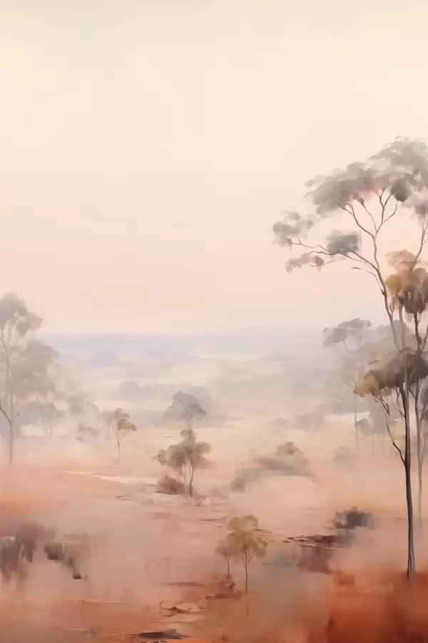 Poster Eine Landschaft mit Sträuchern und Bäumen in Pastelltönen von Rosa, Orange und Braun, mit Bergen im Hintergrund Nr f45554
