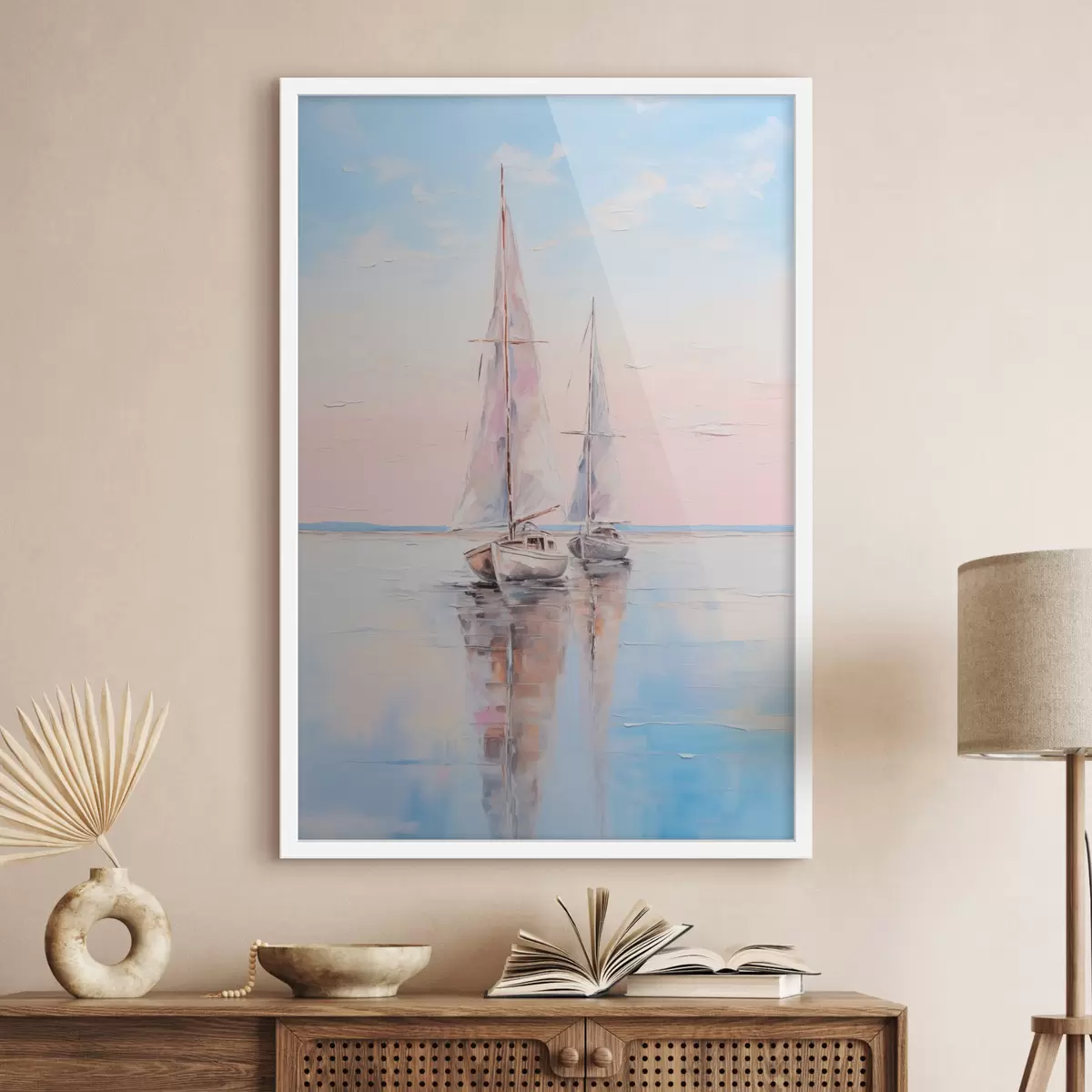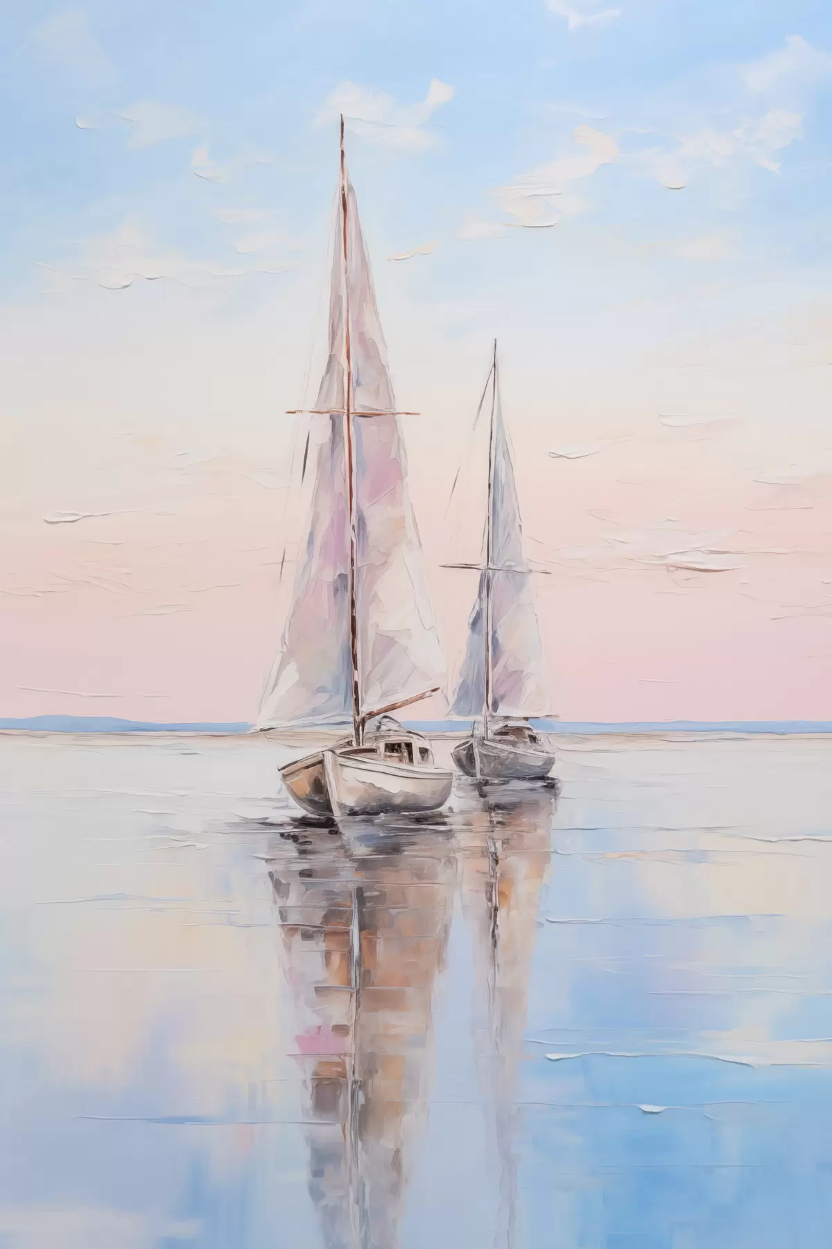 Poster Segelboote mit rosafarbenen Segeln, die auf einer ruhigen See treiben, Spiegelungen der Boote im Wasser, sanfte Pastellfarben Nr f45558