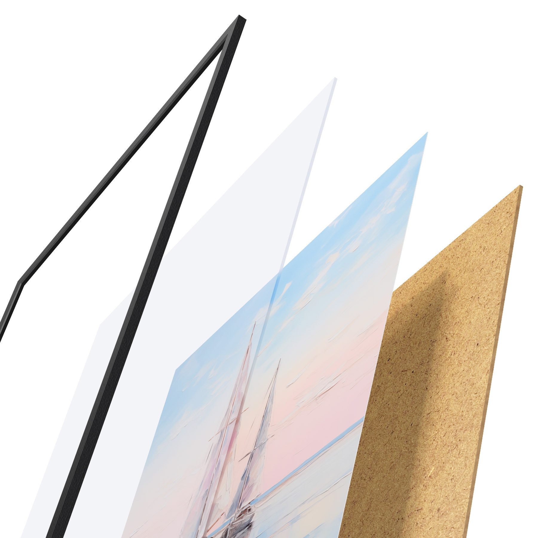 Das Poster besteht aus einem Rahmen, Plexiglas, einem gedruckten Bild und einer Rückwand aus Spanplatten. Dank der Halterungen auf der Rückseite kann das Poster sofort an die Wand gehängt werden.