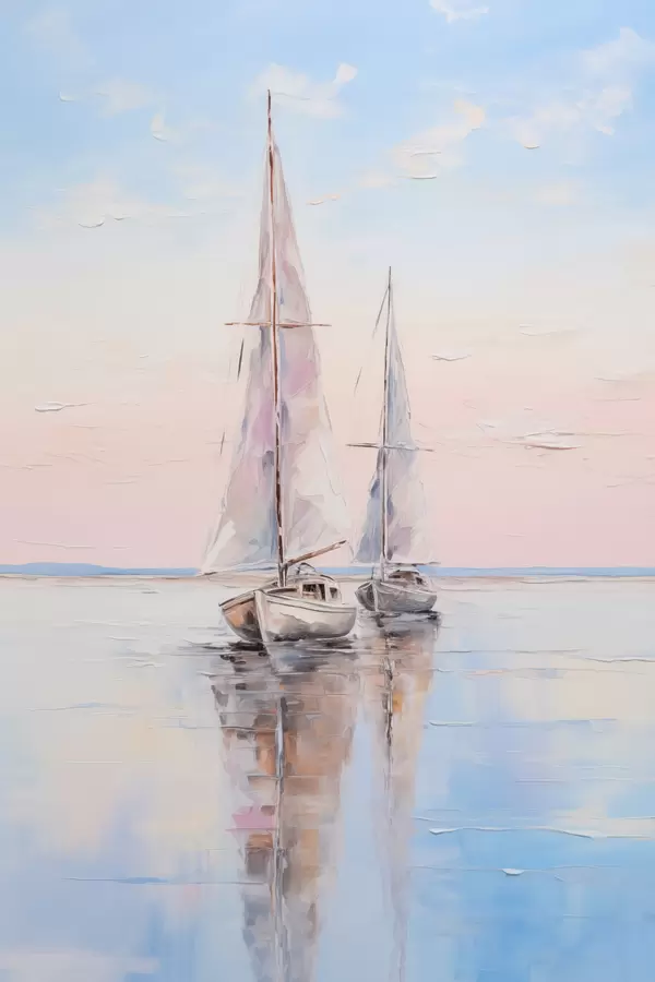 Poster Segelboote mit rosafarbenen Segeln, die auf einer ruhigen See treiben, Spiegelungen der Boote im Wasser, sanfte Pastellfarben Nr f45558