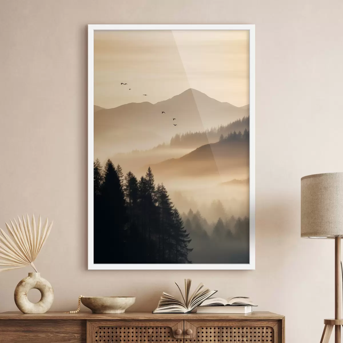 Poster Eine Berglandschaft mit einem Wald und Vögeln fliegen in den Himmel, alle in einer dicken Schicht von Nebel während des Sonnenaufgangs bedeckt f45563