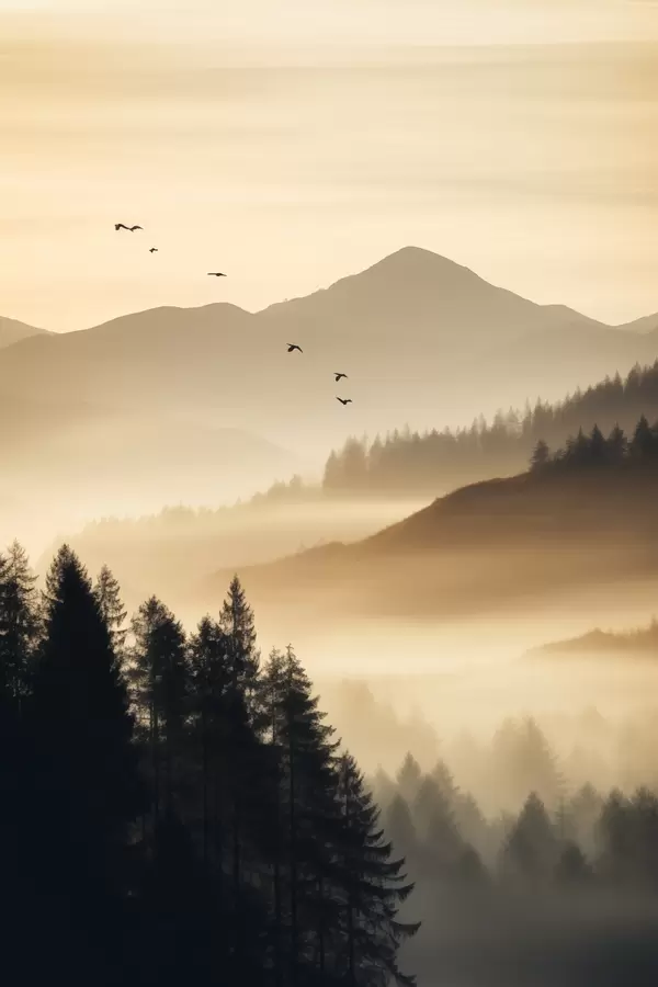 Poster Eine Berglandschaft mit einem Wald und Vögeln fliegen in den Himmel, alle in einer dicken Schicht von Nebel während des Sonnenaufgangs bedeckt f45563