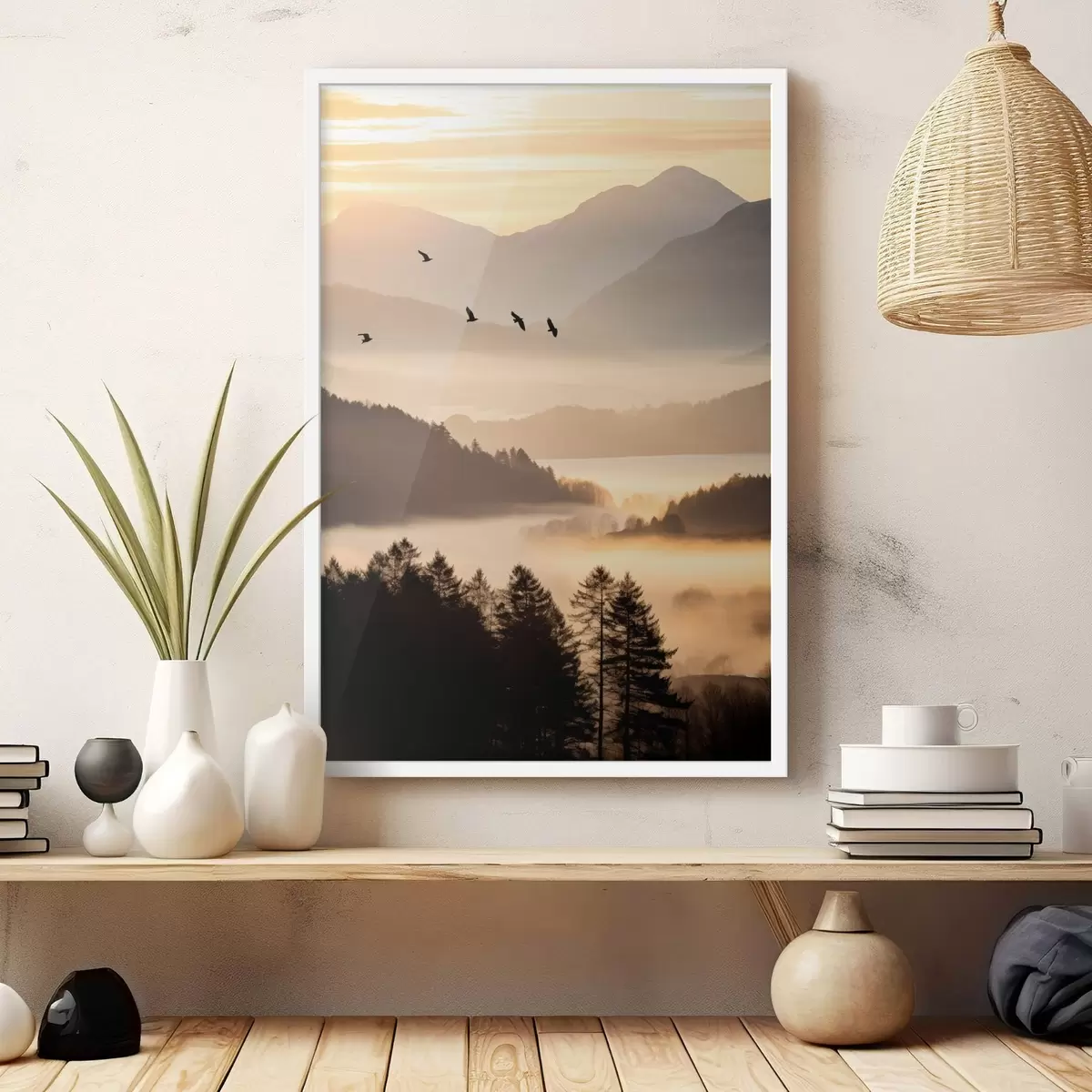 Poster Eine Berglandschaft mit einem Wald und Vögeln fliegen in den Himmel, alle in einer dicken Schicht von Nebel während des Sonnenaufgangs bedeckt f45564