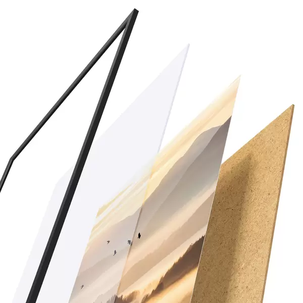 Das Poster besteht aus einem Rahmen, Plexiglas, einem gedruckten Bild und einer Rückwand aus Spanplatten. Dank der Halterungen auf der Rückseite kann das Poster sofort an die Wand gehängt werden.