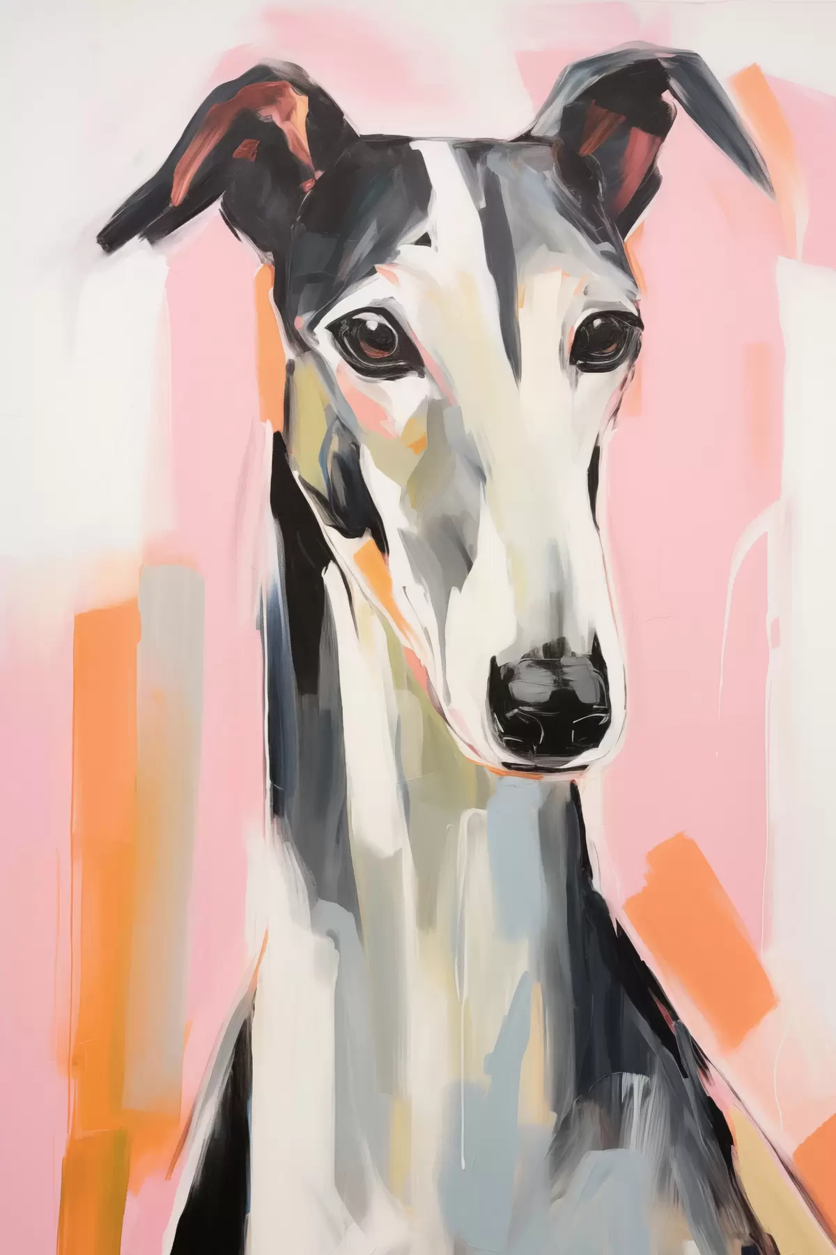 Poster Ein Windhund vor einem Hintergrund aus rosa, orangefarbenen und weißen Pinselstrichen Nr f45566