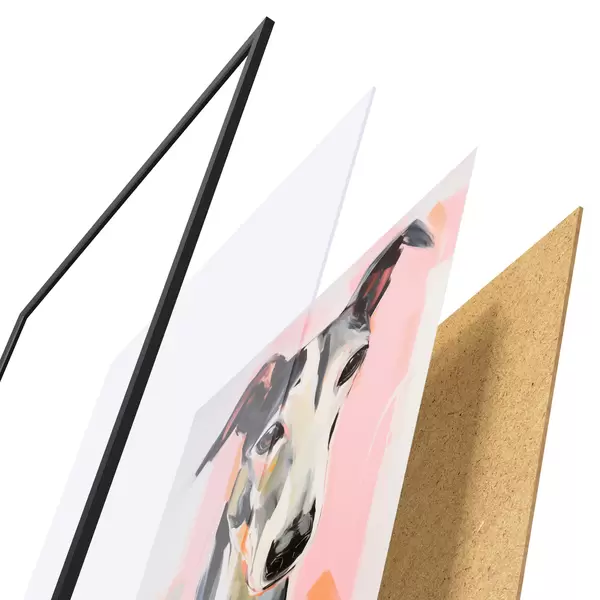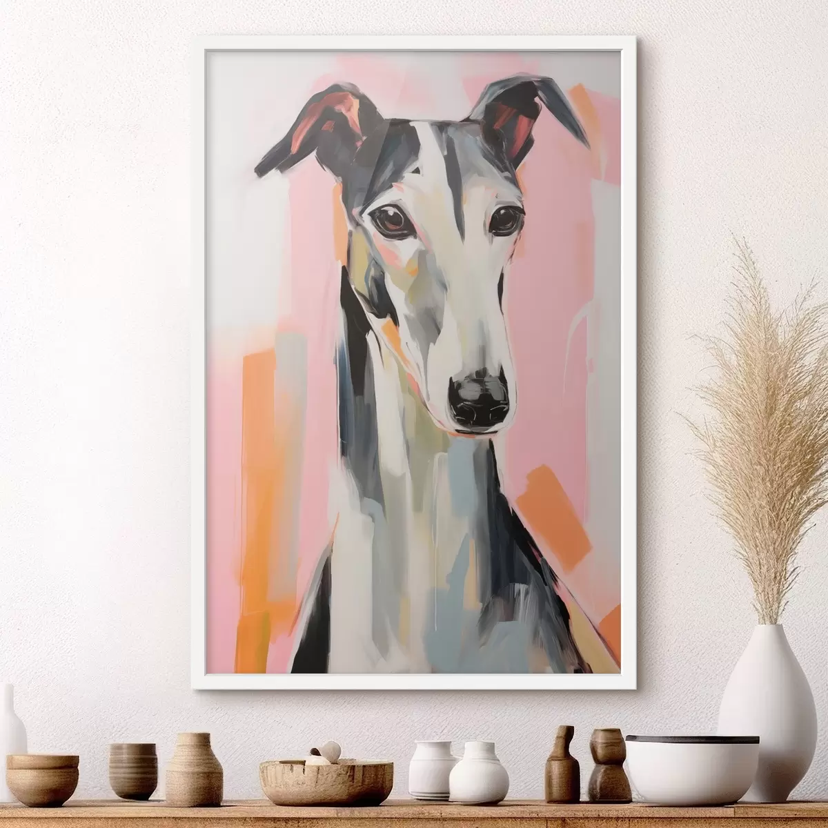 Poster Ein Windhund vor einem Hintergrund aus rosa, orangefarbenen und weißen Pinselstrichen f45566