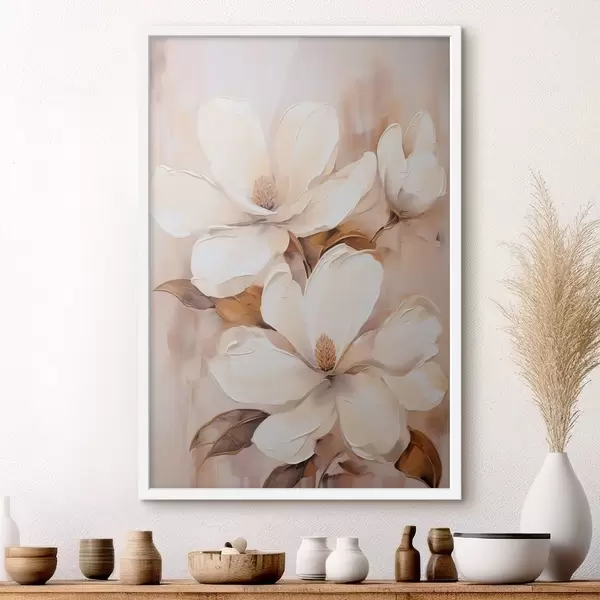 Poster Weiße Magnolienblüten vor einem weichen, unscharfen Hintergrund aus Beige- und Brauntönen, Malstil Nr f45572