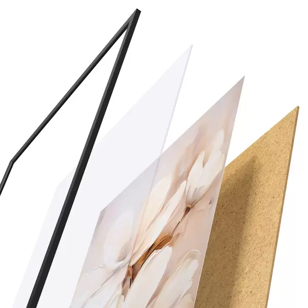 Das Poster besteht aus einem Rahmen, Plexiglas, einem gedruckten Bild und einer Rückwand aus Spanplatten. Dank der Halterungen auf der Rückseite kann das Poster sofort an die Wand gehängt werden.