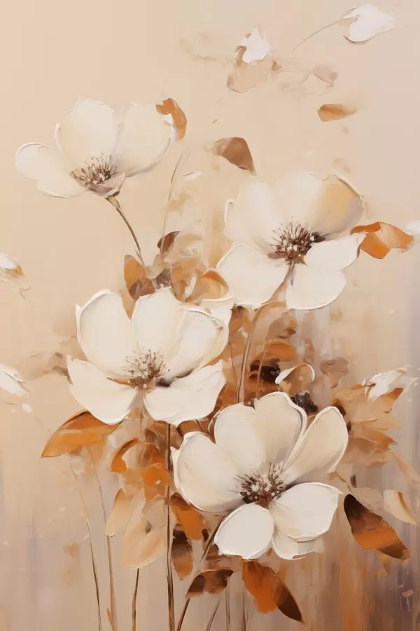 Poster Weiße Blumen mit orangefarbenen Blättern, zarte Pinselstriche, warme Farbpalette, elegante Komposition Nr f45573
