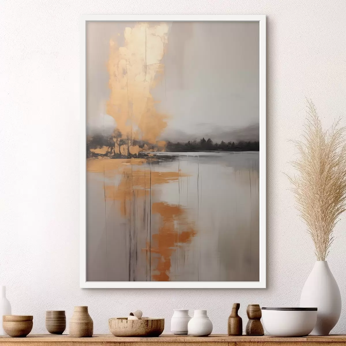 Poster Eine abstrakte Landschaft mit einem See, Baum und gelben Nebel, das Wasser spiegelt und bewölkten Himmel Nr f45575