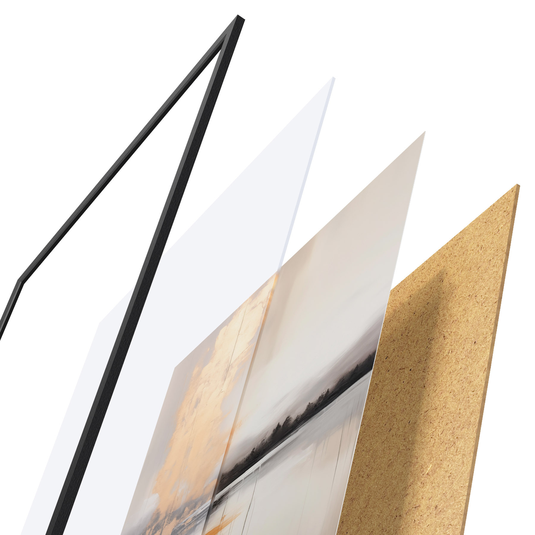Das Poster besteht aus einem Rahmen, Plexiglas, einem gedruckten Bild und einer Rückwand aus Spanplatten. Dank der Halterungen auf der Rückseite kann das Poster sofort an die Wand gehängt werden.