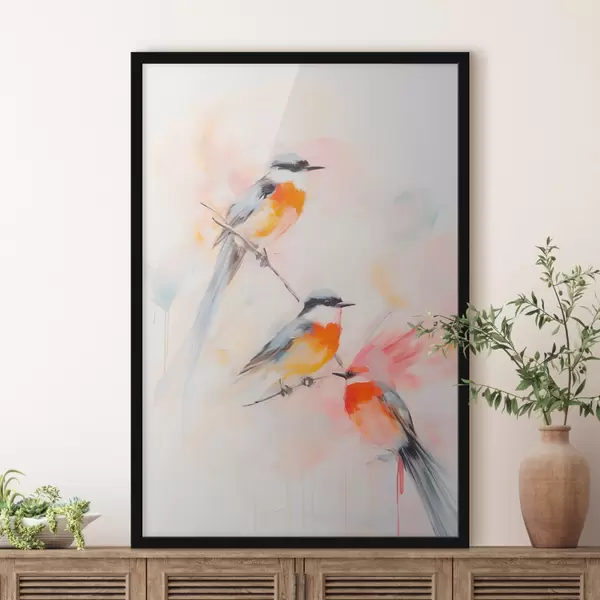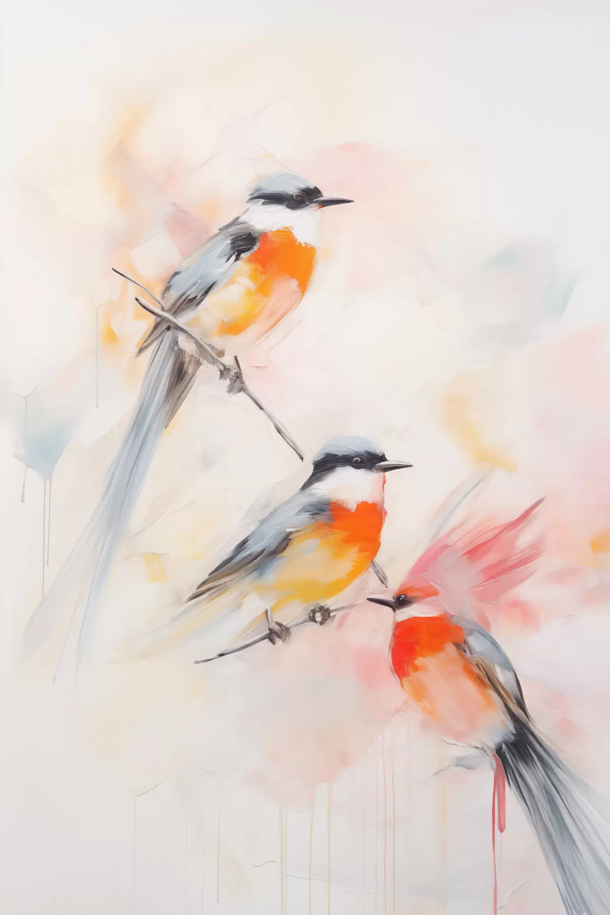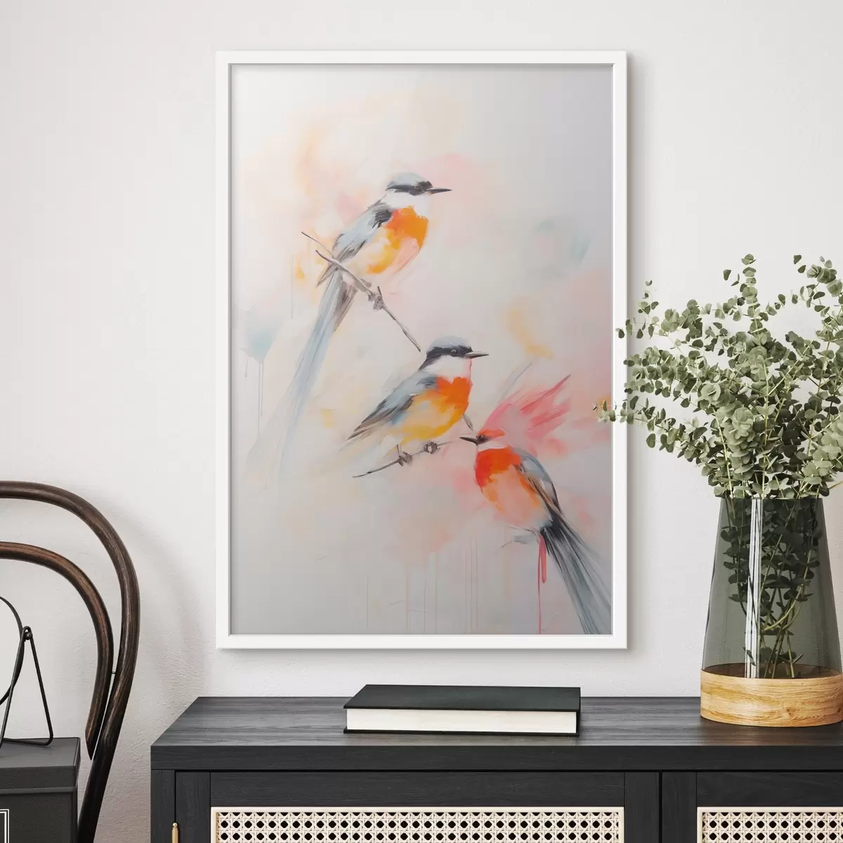 Poster Vögel auf Zweigen, weiche Pastellfarben, heller Hintergrund mit rosa und weißen Farbtönen Nr f45577