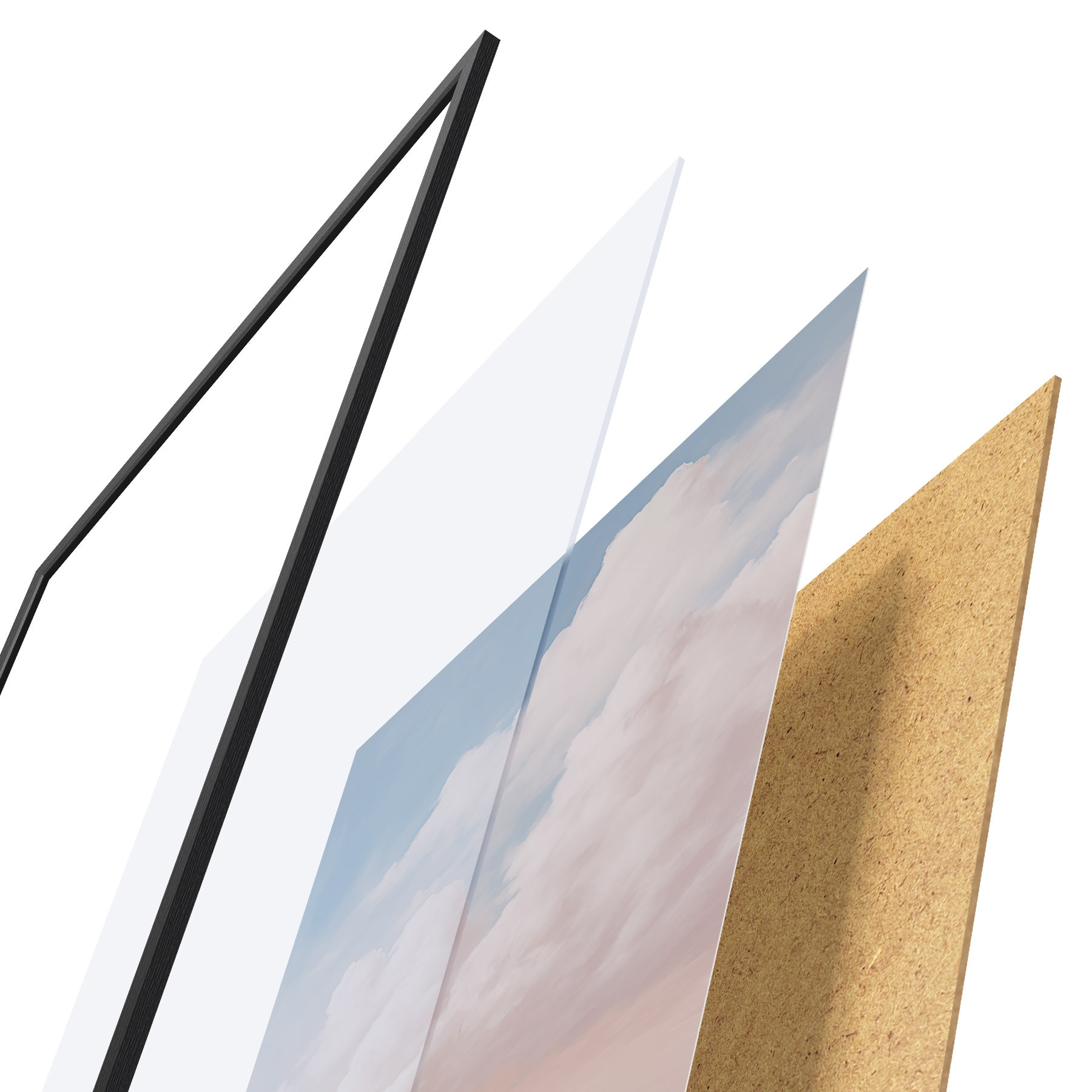 Das Poster besteht aus einem Rahmen, Plexiglas, einem gedruckten Bild und einer Rückwand aus Spanplatten. Dank der Halterungen auf der Rückseite kann das Poster sofort an die Wand gehängt werden.