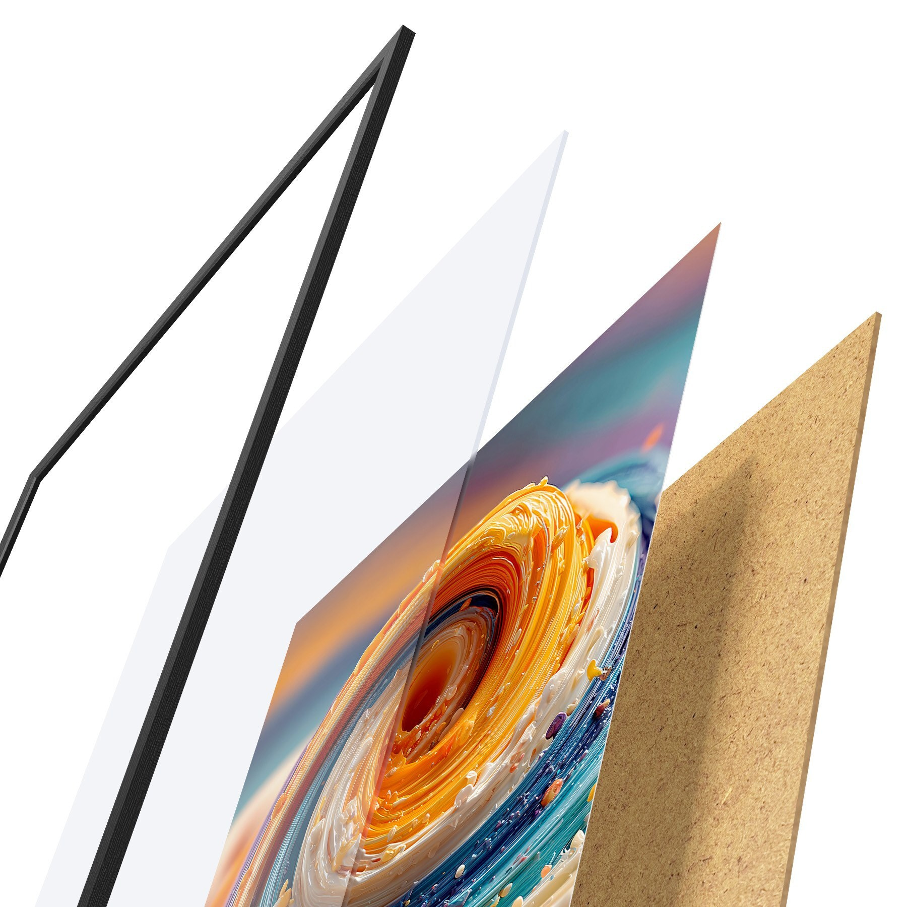 Das Poster besteht aus einem Rahmen, Plexiglas, einem gedruckten Bild und einer Rückwand aus Spanplatten. Dank der Halterungen auf der Rückseite kann das Poster sofort an die Wand gehängt werden.