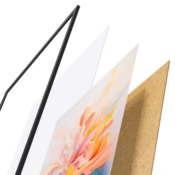 Das Poster besteht aus einem Rahmen, Plexiglas, einem gedruckten Bild und einer Rückwand aus Spanplatten. Dank der Halterungen auf der Rückseite kann das Poster sofort an die Wand gehängt werden.
