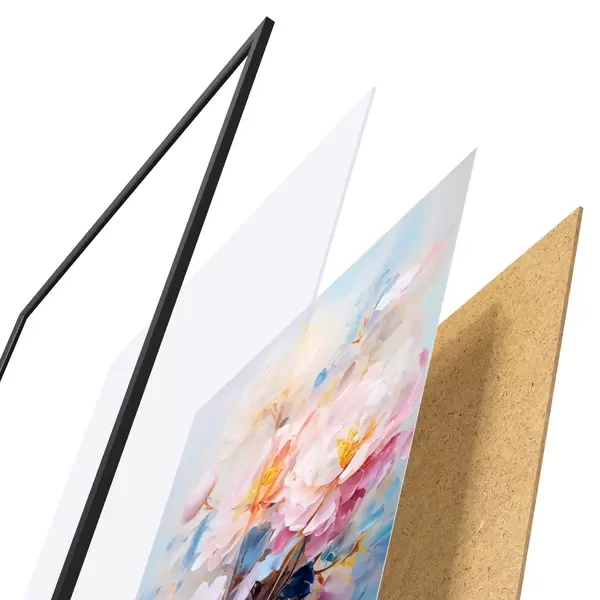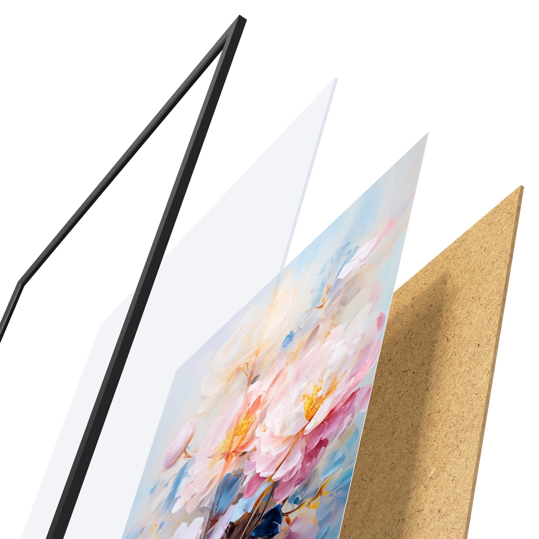 Das Poster besteht aus einem Rahmen, Plexiglas, einem gedruckten Bild und einer Rückwand aus Spanplatten. Dank der Halterungen auf der Rückseite kann das Poster sofort an die Wand gehängt werden.