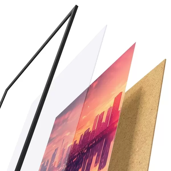 Das Poster besteht aus einem Rahmen, Plexiglas, einem gedruckten Bild und einer Rückwand aus Spanplatten. Dank der Halterungen auf der Rückseite kann das Poster sofort an die Wand gehängt werden.