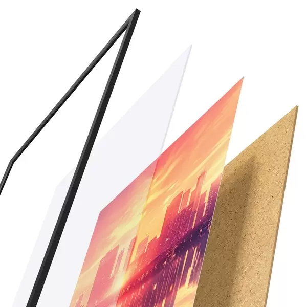 Das Poster besteht aus einem Rahmen, Plexiglas, einem gedruckten Bild und einer Rückwand aus Spanplatten. Dank der Halterungen auf der Rückseite kann das Poster sofort an die Wand gehängt werden.