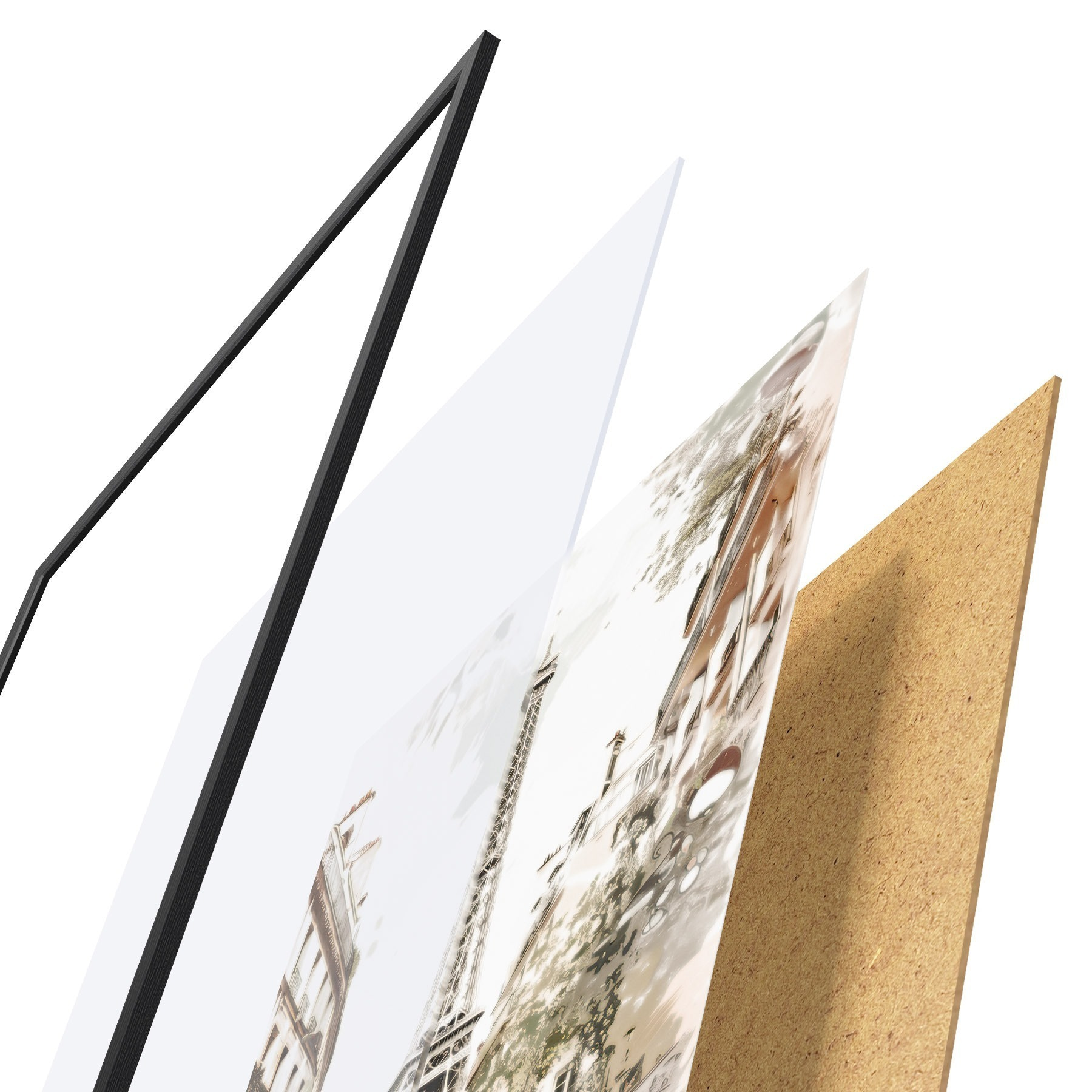 Das Poster besteht aus einem Rahmen, Plexiglas, einem gedruckten Bild und einer Rückwand aus Spanplatten. Dank der Halterungen auf der Rückseite kann das Poster sofort an die Wand gehängt werden.