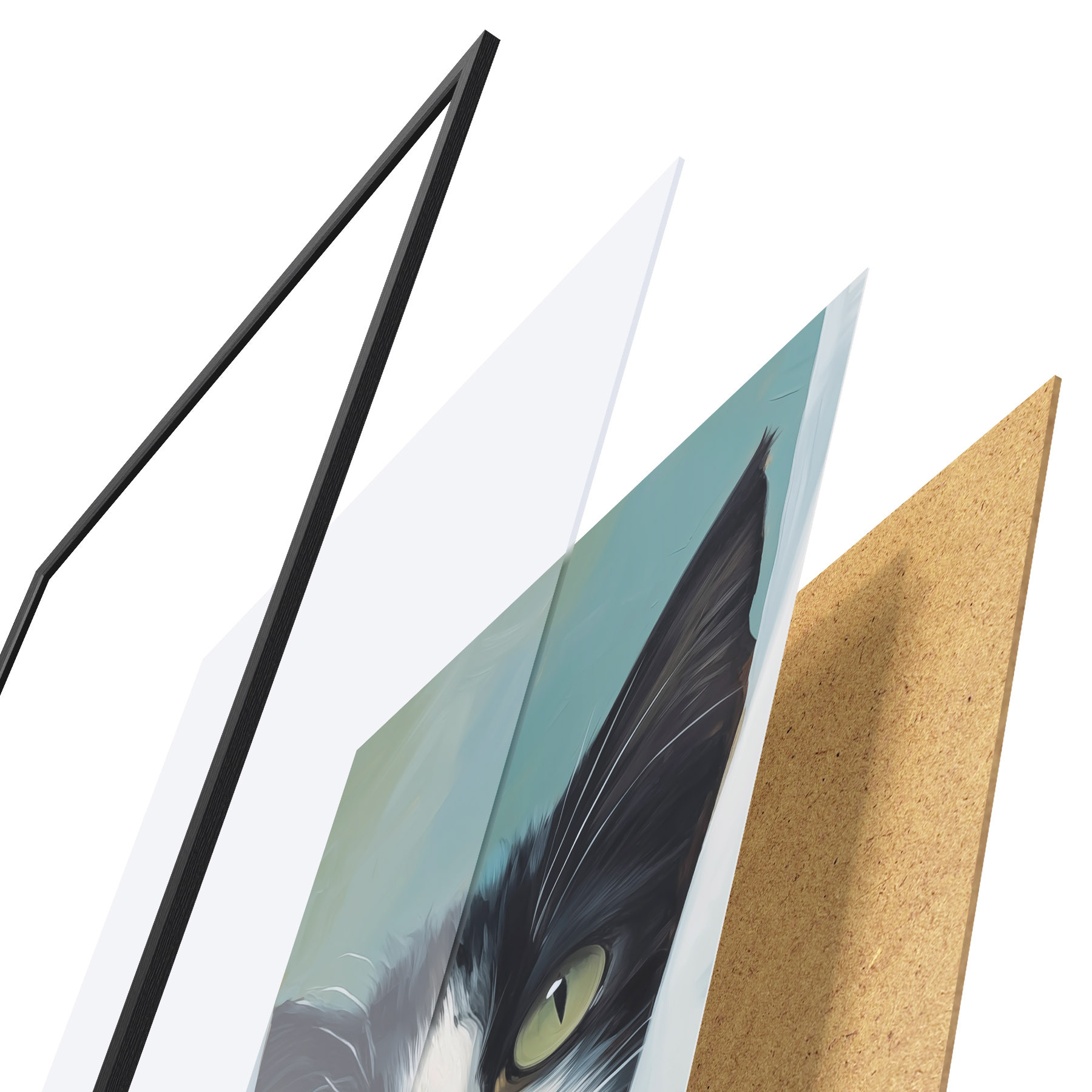 Das Poster besteht aus einem Rahmen, Plexiglas, einem gedruckten Bild und einer Rückwand aus Spanplatten. Dank der Halterungen auf der Rückseite kann das Poster sofort an die Wand gehängt werden.