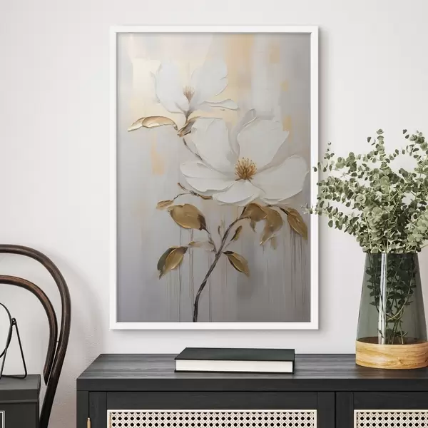 Poster Zwei weiße Blüten mit gelb-orangefarbenen Blättern auf hellem Hintergrund Nr f45691